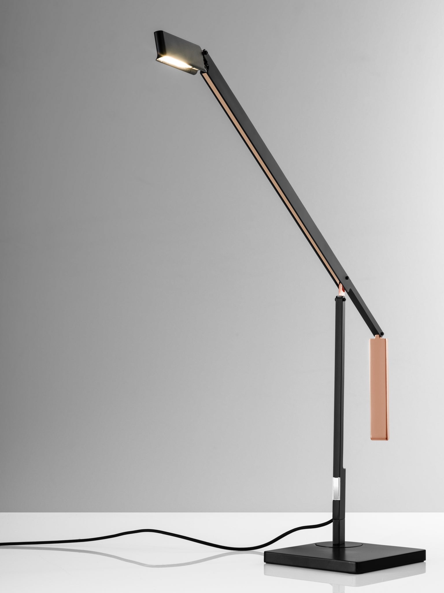 With straight lines and sharp edges, the fluid shape of the Lazzaro LED Desk Lamp is broken up by differing materials and finishes. A shiny copper counterweight keeps the lamp balanced at every angle, so that the light remains in the position that you choose with ease. Adjustable at every joint, this lamp reaches 14.5 to 24 inches of height while also rotating smoothly left to right. This slim, minimalistic design includes a 5/8" thick rotating shade that yields 530 lumens of functional task lighting that is dimmable by a touch switch located on the pole.