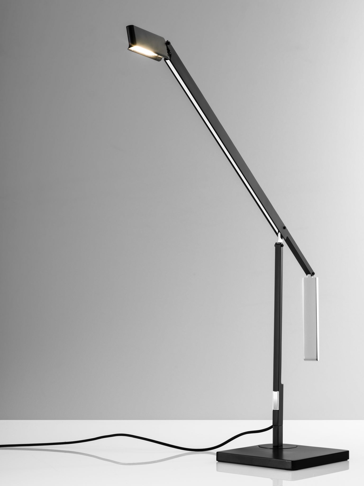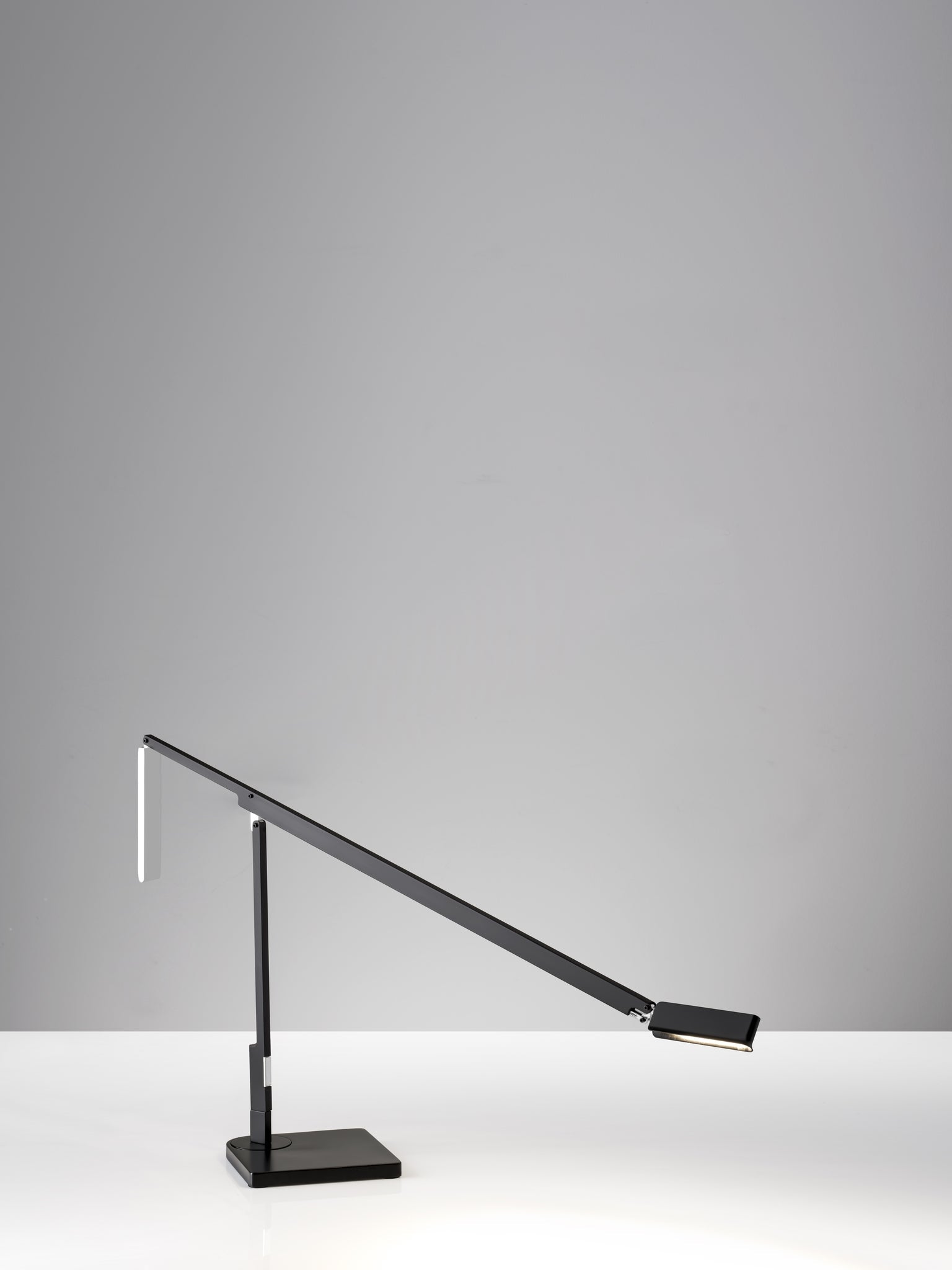 With straight lines and sharp edges, the fluid shape of the Lazzaro LED Desk Lamp is broken up by differing materials and finishes. A shiny chrome counterweight keeps the lamp balanced at every angle, so that the light remains in the position that you choose with ease. Adjustable at every joint, this lamp reaches 14.5 to 24 inches of height while also rotating smoothly left to right. This slim, minimalistic design includes a 5/8" thick rotating shade that yields 530 lumens of functional task lighting that is dimmable by a touch switch located on the pole.
