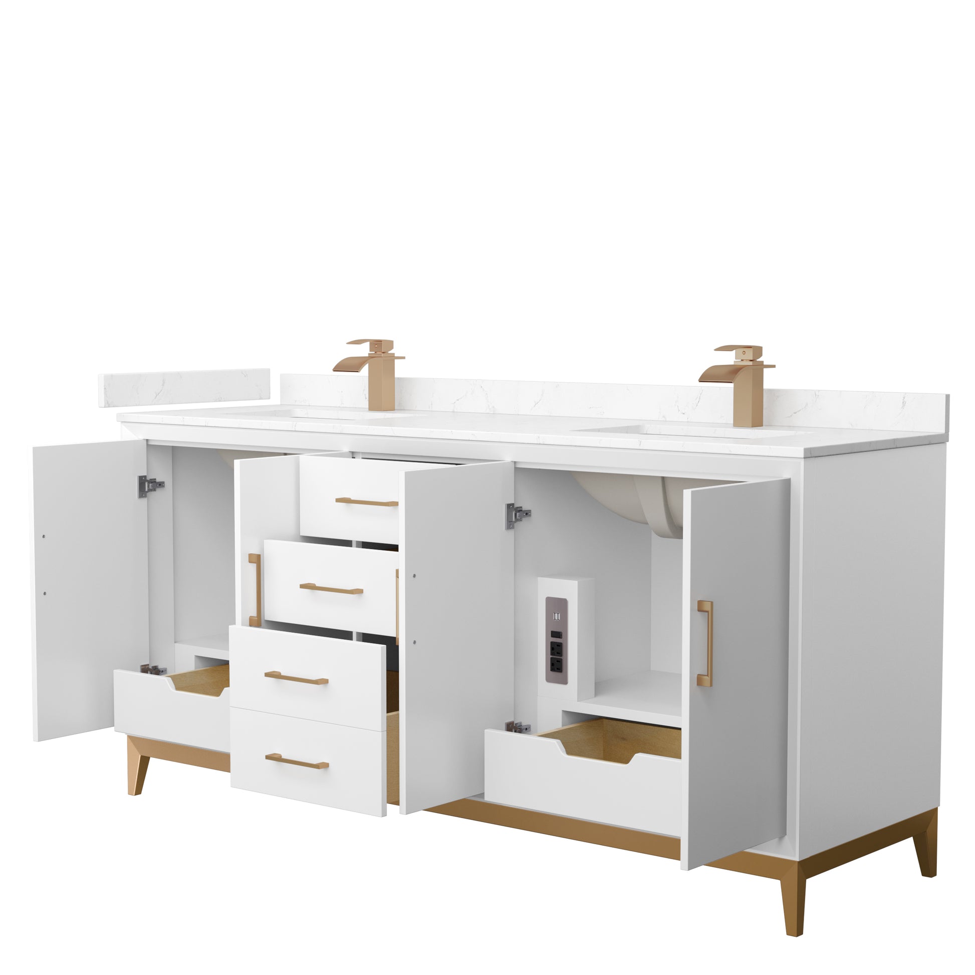 Amici 72 Inch Double Bathroom Vanity in White, Carrara Cultured Marble Countertop, Undermount Square Sinks, Satin Bronze Trim