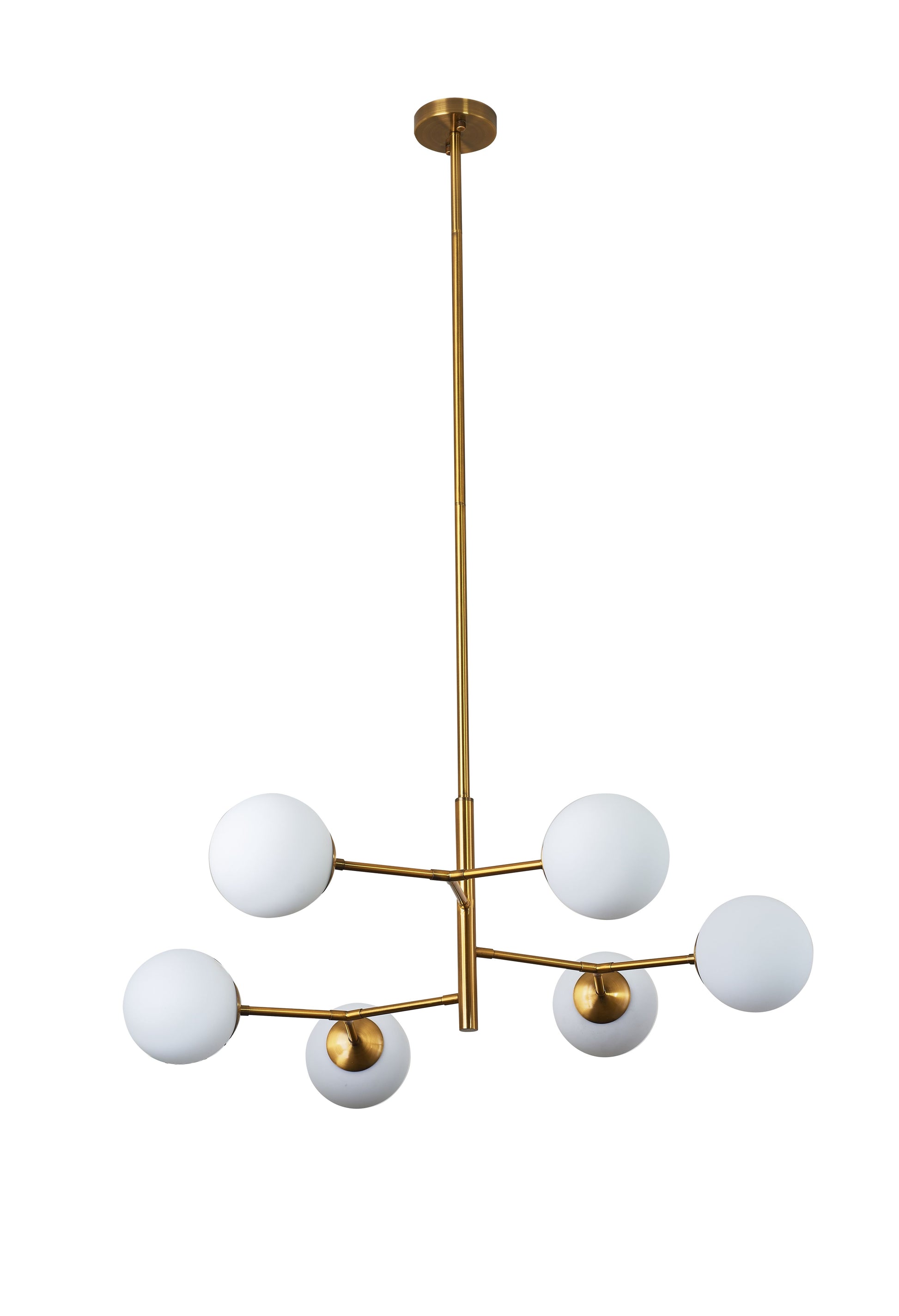 This modern ceiling fixture is in an antique brass finish. It comes with three arms and six white glass globe shades. This fixture can be used in any room and provide better illumination.