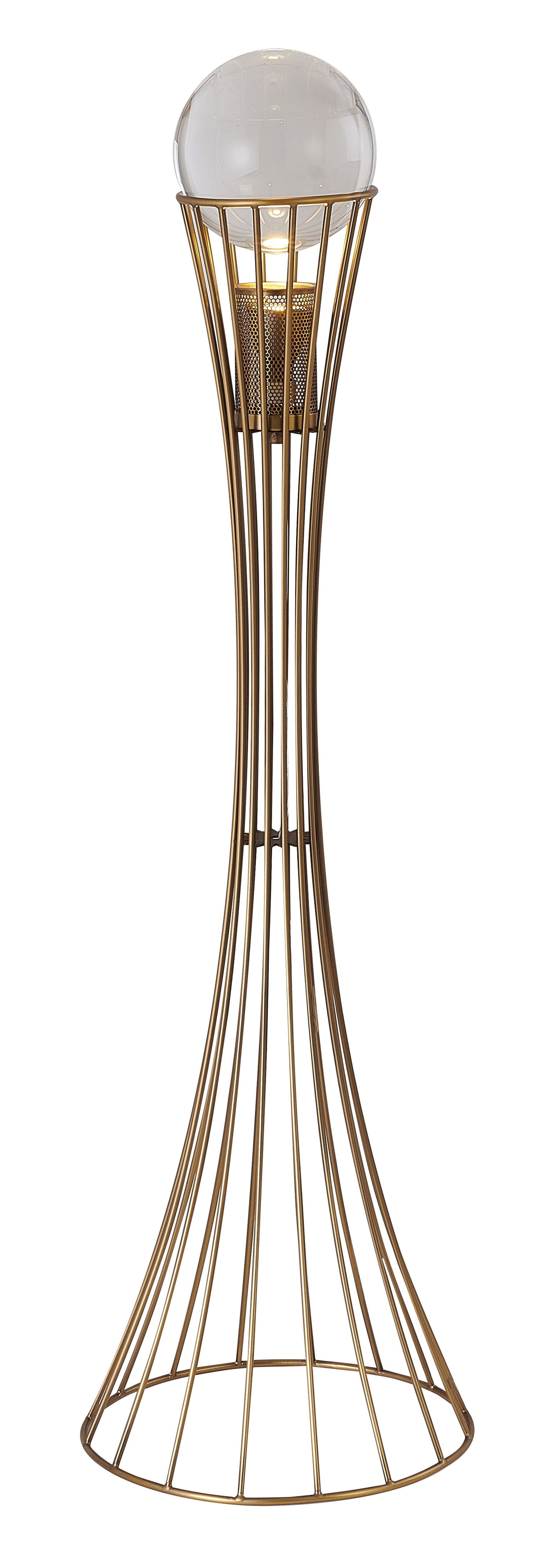 This exquisite floor lamp is in an antique brass finish. The base is made out of metal, and there is a crystal ball in clear color on the top. It also comes with an ON/OFF switch. This floor lamp is great for chair side reading or general room illumination.