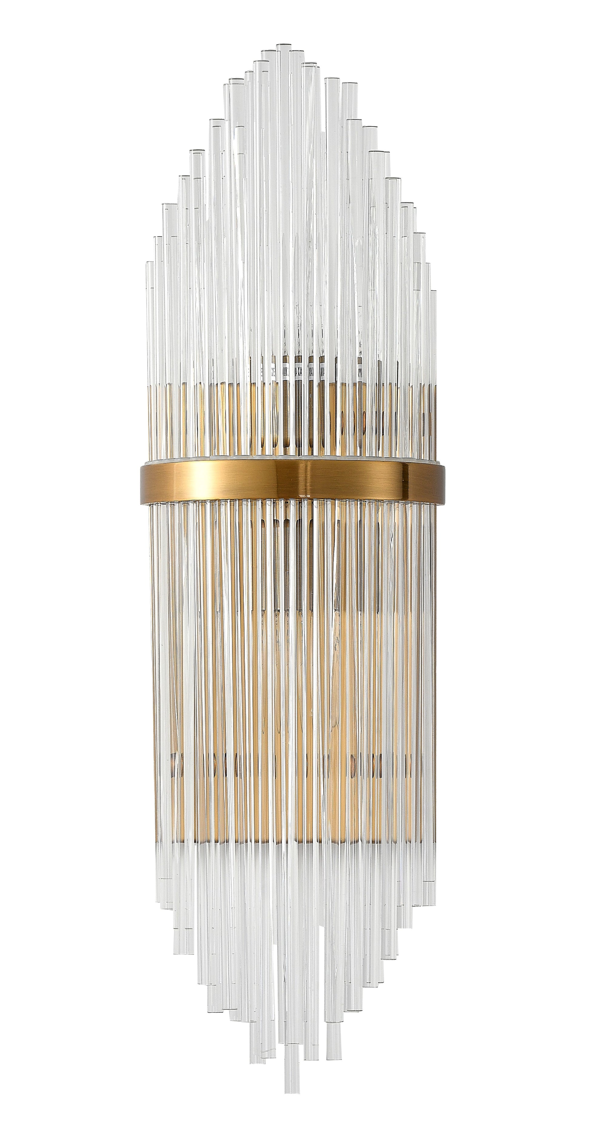 This exquisite wall sconce is in an antique brass finish. The frame is made out of metal, and it comes with glass rod in clear color.