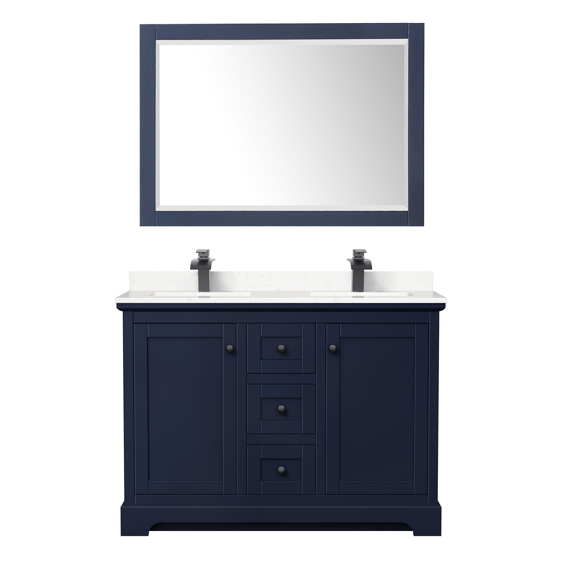 Avery 48 Inch Double Bathroom Vanity in Dark Blue, Carrara Cultured Marble Countertop, Undermount Square Sinks, Matte Black Trim, 46 Inch Mirror