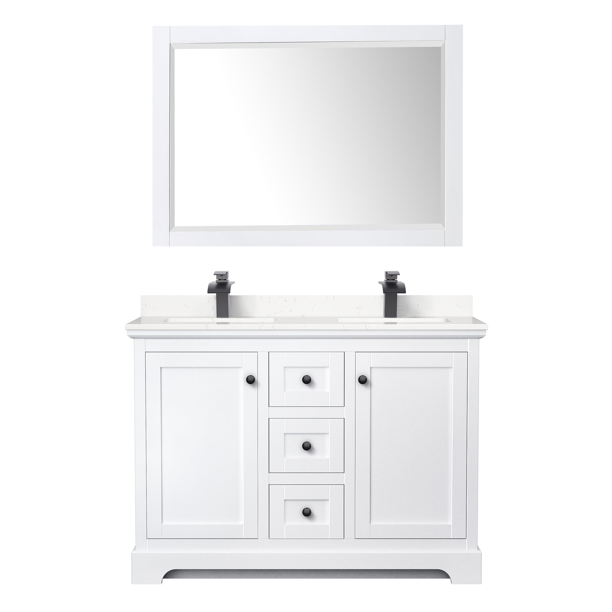 Avery 48 Inch Double Bathroom Vanity in White, Carrara Cultured Marble Countertop, Undermount Square Sinks, Matte Black Trim, 46 Inch Mirror
