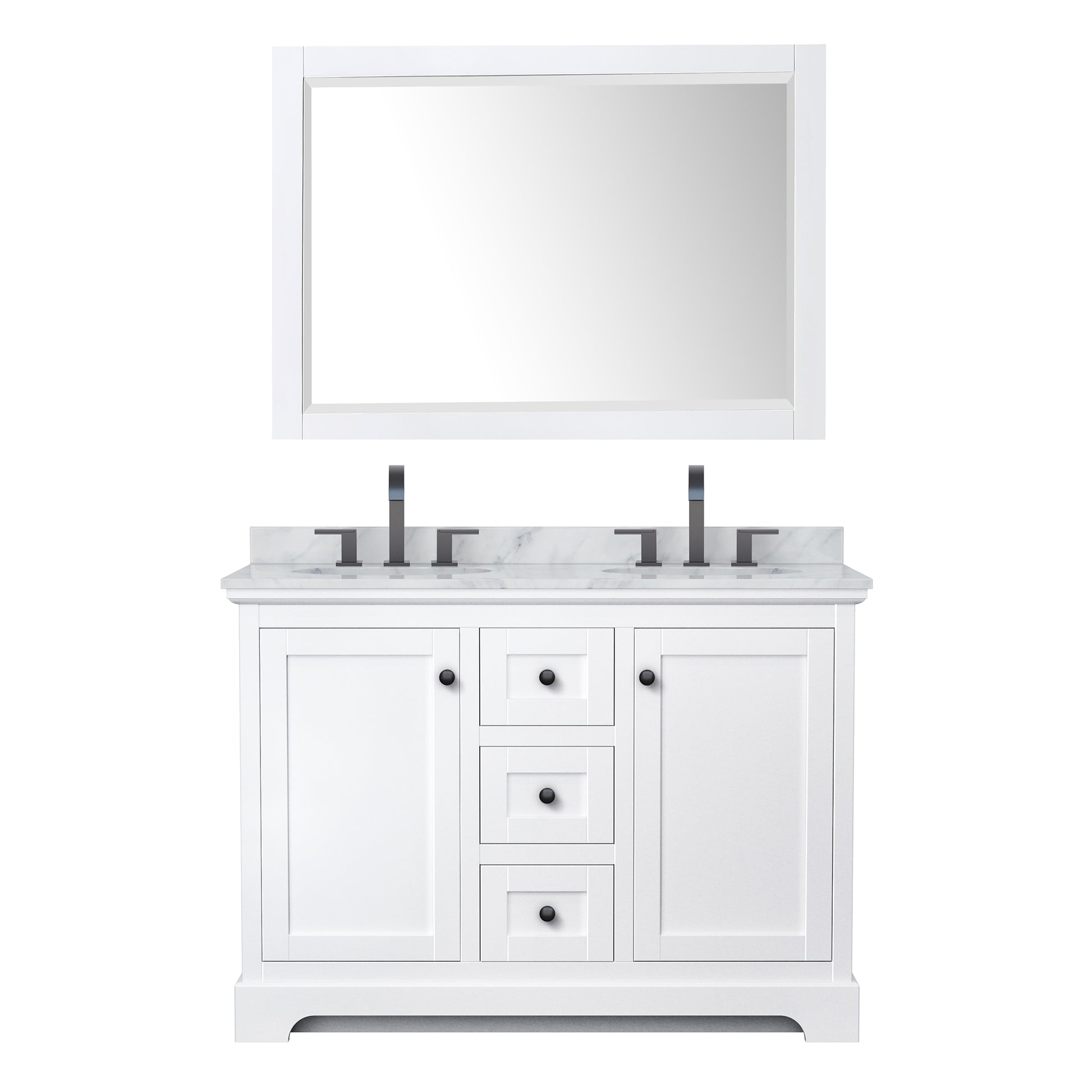 Avery 48 Inch Double Bathroom Vanity in White, White Carrara Marble Countertop, Undermount Oval Sinks, Matte Black Trim, 46 Inch Mirror