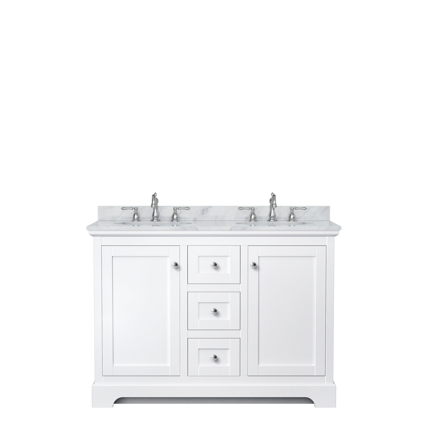 Avery 48 Inch Double Bathroom Vanity in White, White Carrara Marble Countertop, Undermount Oval Sinks, No Mirror