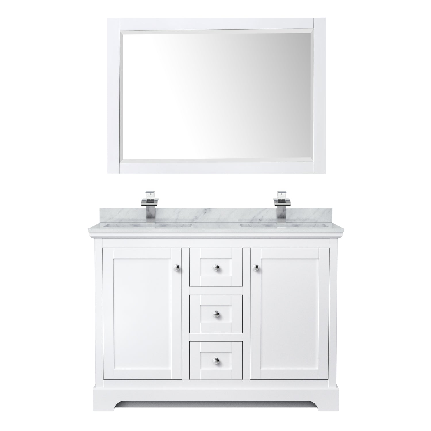 Avery 48 Inch Double Bathroom Vanity in White, White Carrara Marble Countertop, Undermount Square Sinks, 46 Inch Mirror