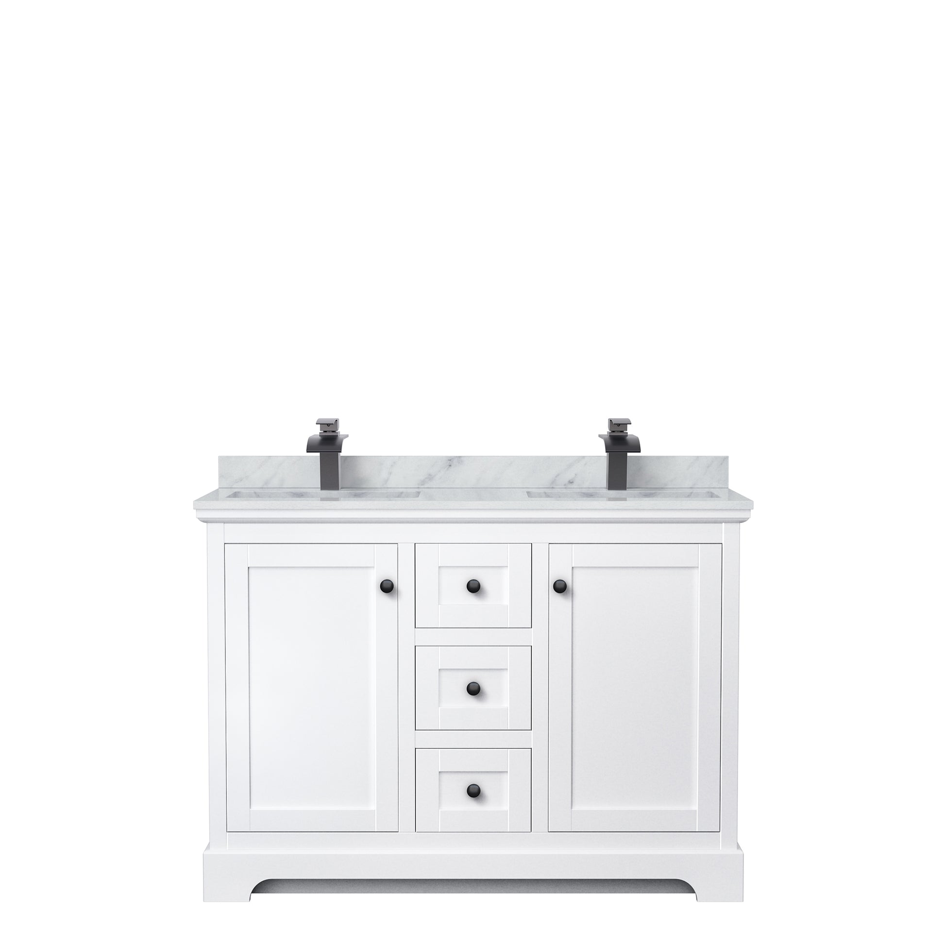 Avery 48 Inch Double Bathroom Vanity in White, White Carrara Marble Countertop, Undermount Square Sinks, Matte Black Trim