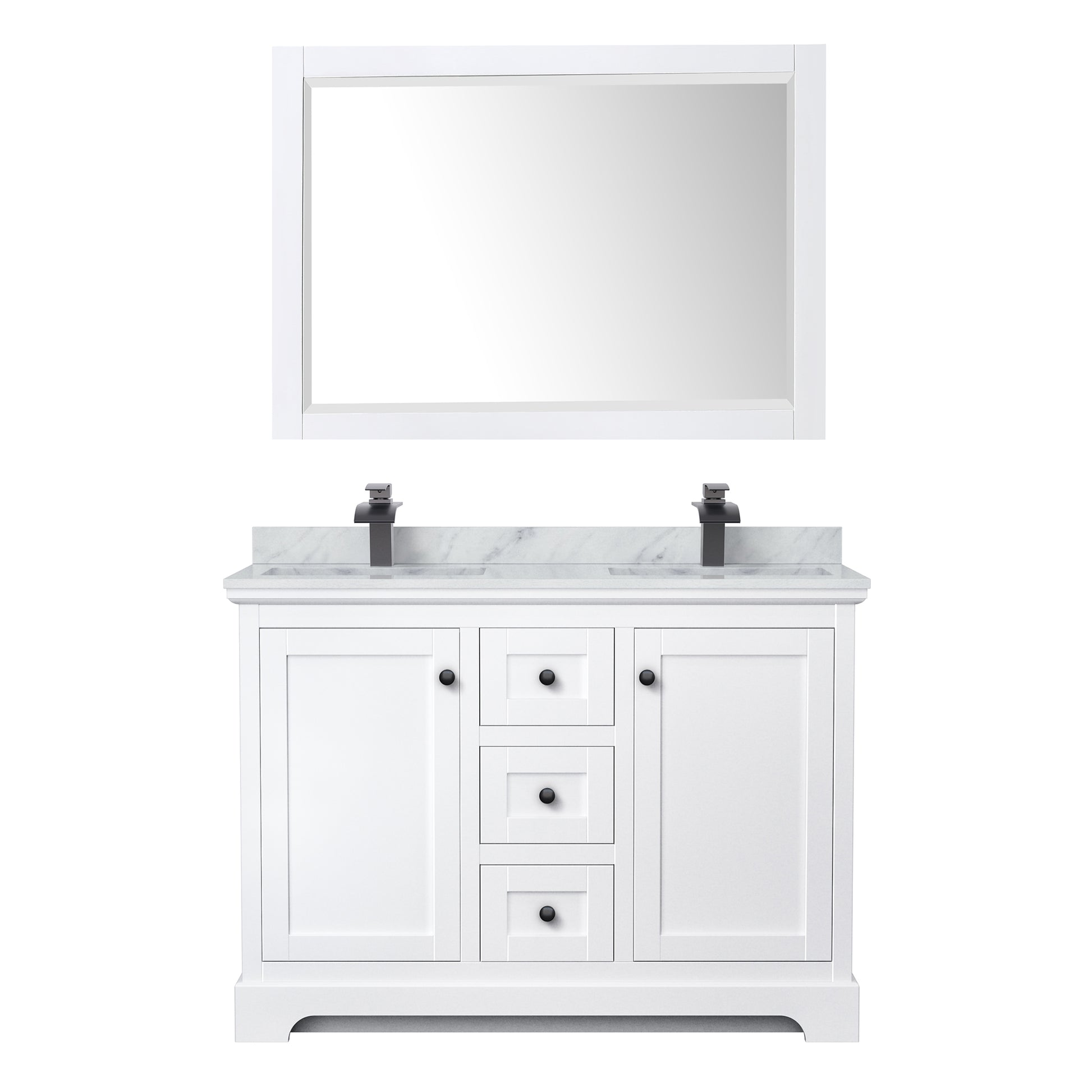Avery 48 Inch Double Bathroom Vanity in White, White Carrara Marble Countertop, Undermount Square Sinks, Matte Black Trim, 46 Inch Mirror