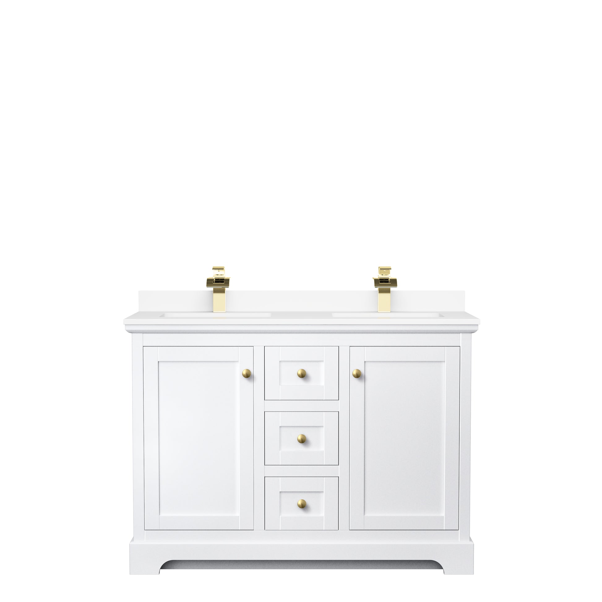 Avery 48 Inch Double Bathroom Vanity in White, White Cultured Marble Countertop, Undermount Square Sinks, Brushed Gold Trim