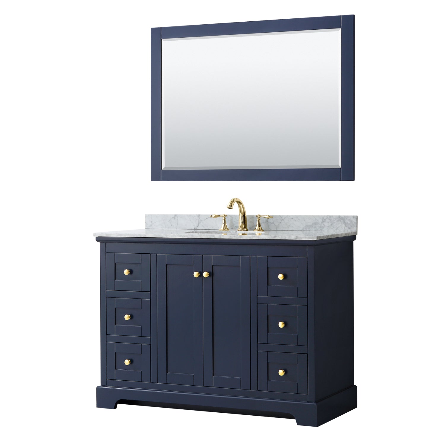 Avery 48 Inch Single Bathroom Vanity in Dark Blue, White Carrara Marble Countertop, Undermount Oval Sink, and 46 Inch Mirror