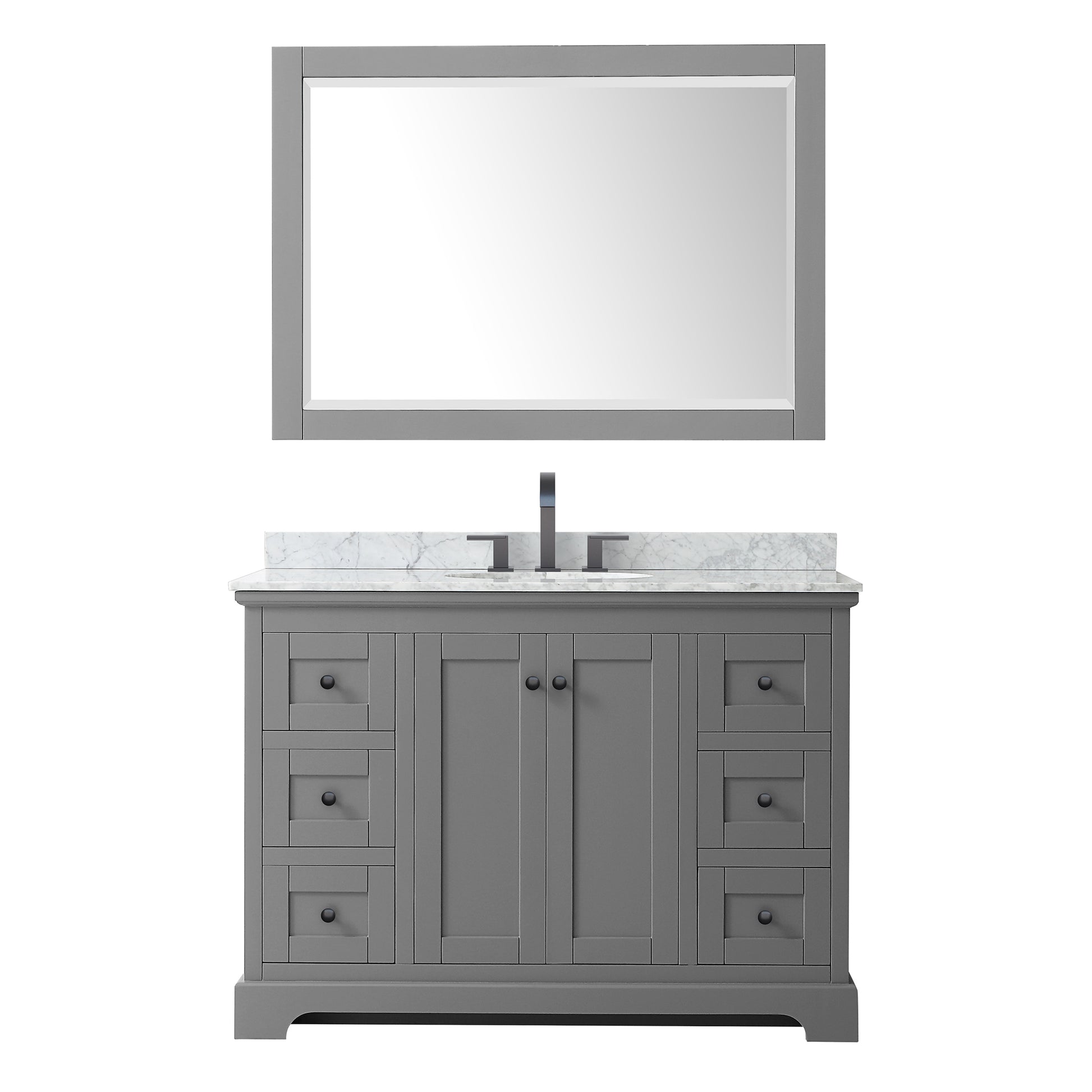 Avery 48 Inch Single Bathroom Vanity in Dark Gray, White Carrara Marble Countertop, Undermount Oval Sink, Matte Black Trim, 46 Inch Mirror