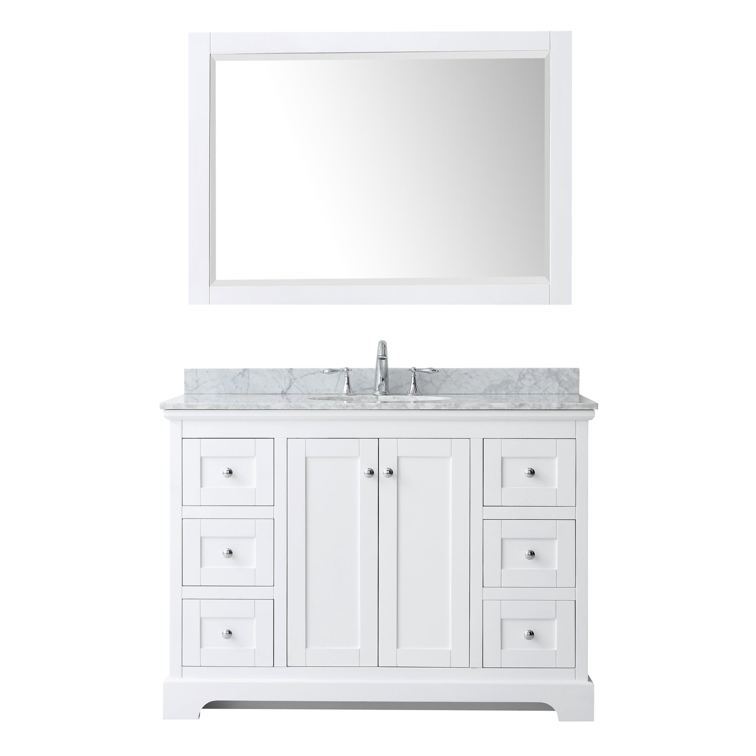 Avery 48 Inch Single Bathroom Vanity in White, White Carrara Marble Countertop, Undermount Oval Sink, and 46 Inch Mirror