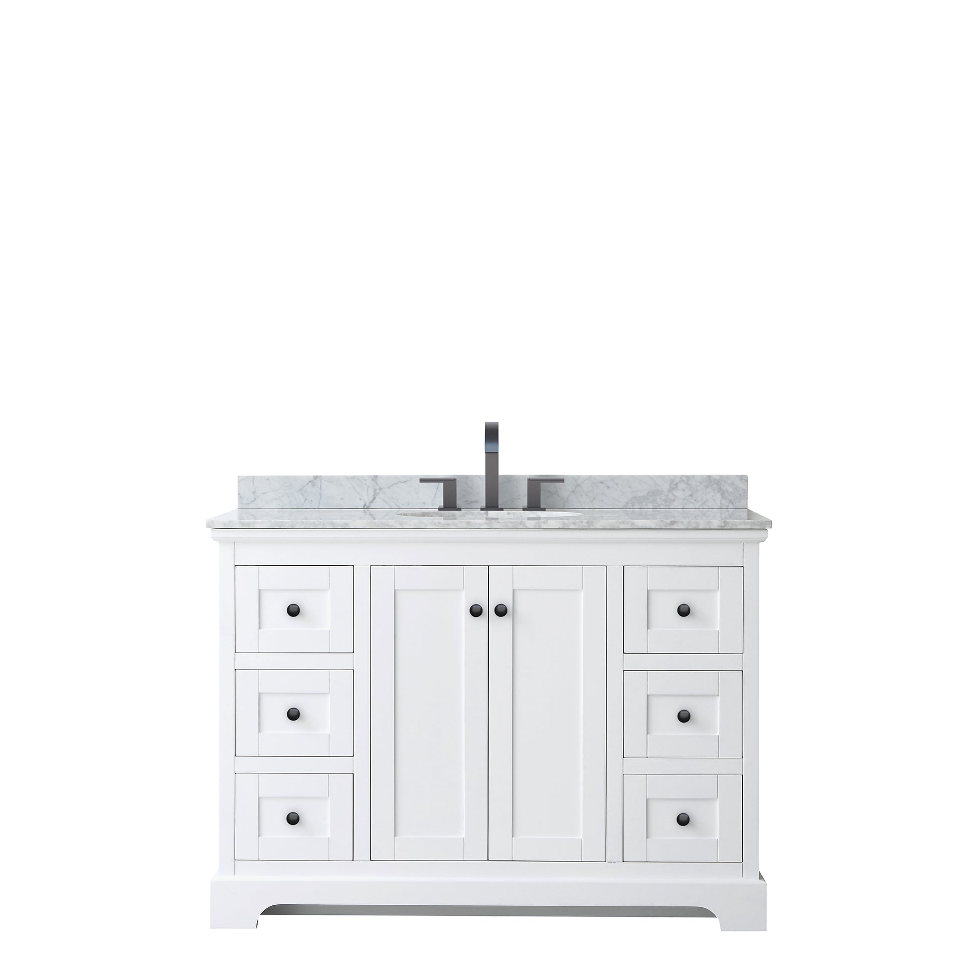 Avery 48 Inch Single Bathroom Vanity in White, White Carrara Marble Countertop, Undermount Oval Sink, Matte Black Trim