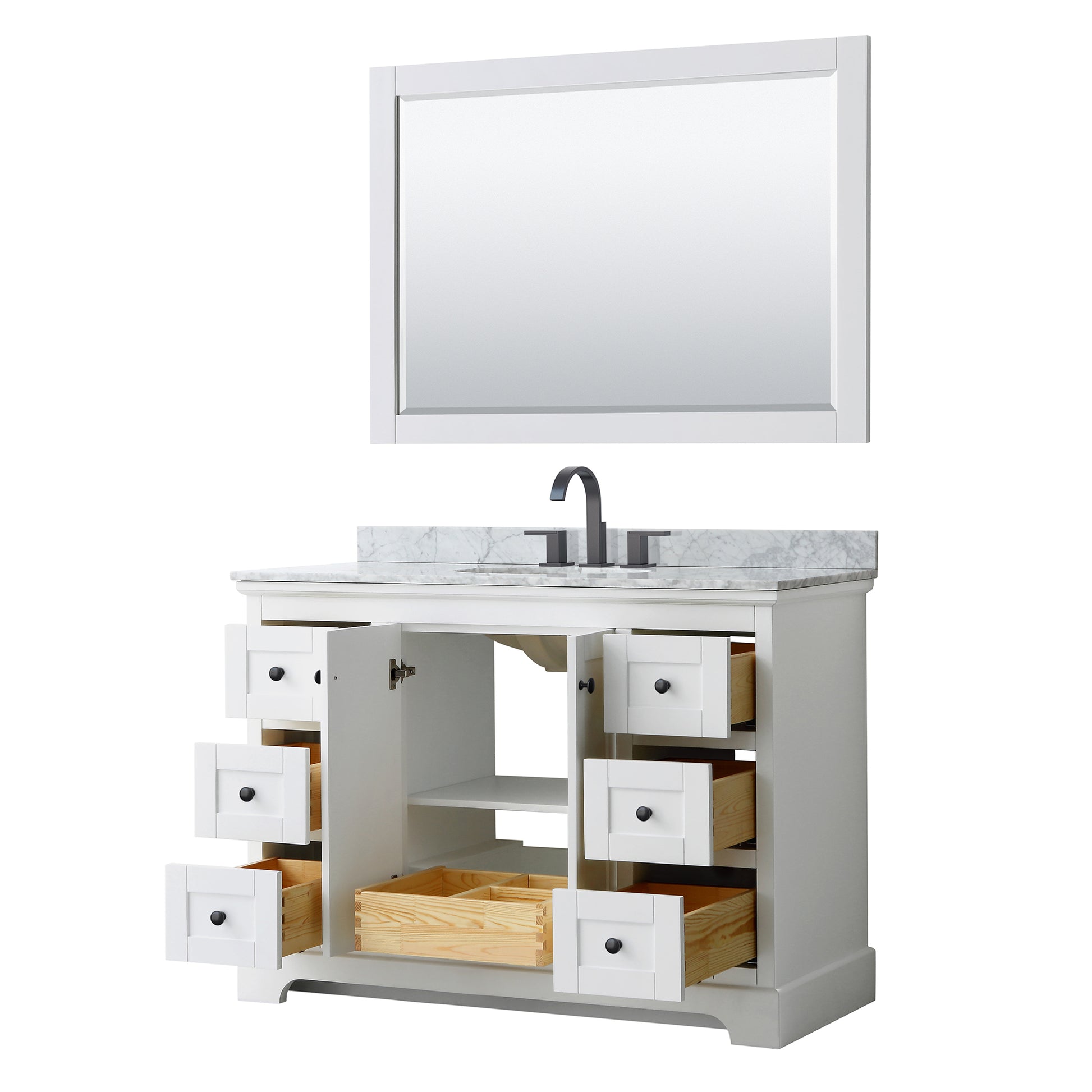 Avery 48 Inch Single Bathroom Vanity in White, White Carrara Marble Countertop, Undermount Oval Sink, Matte Black Trim, 46 Inch Mirror