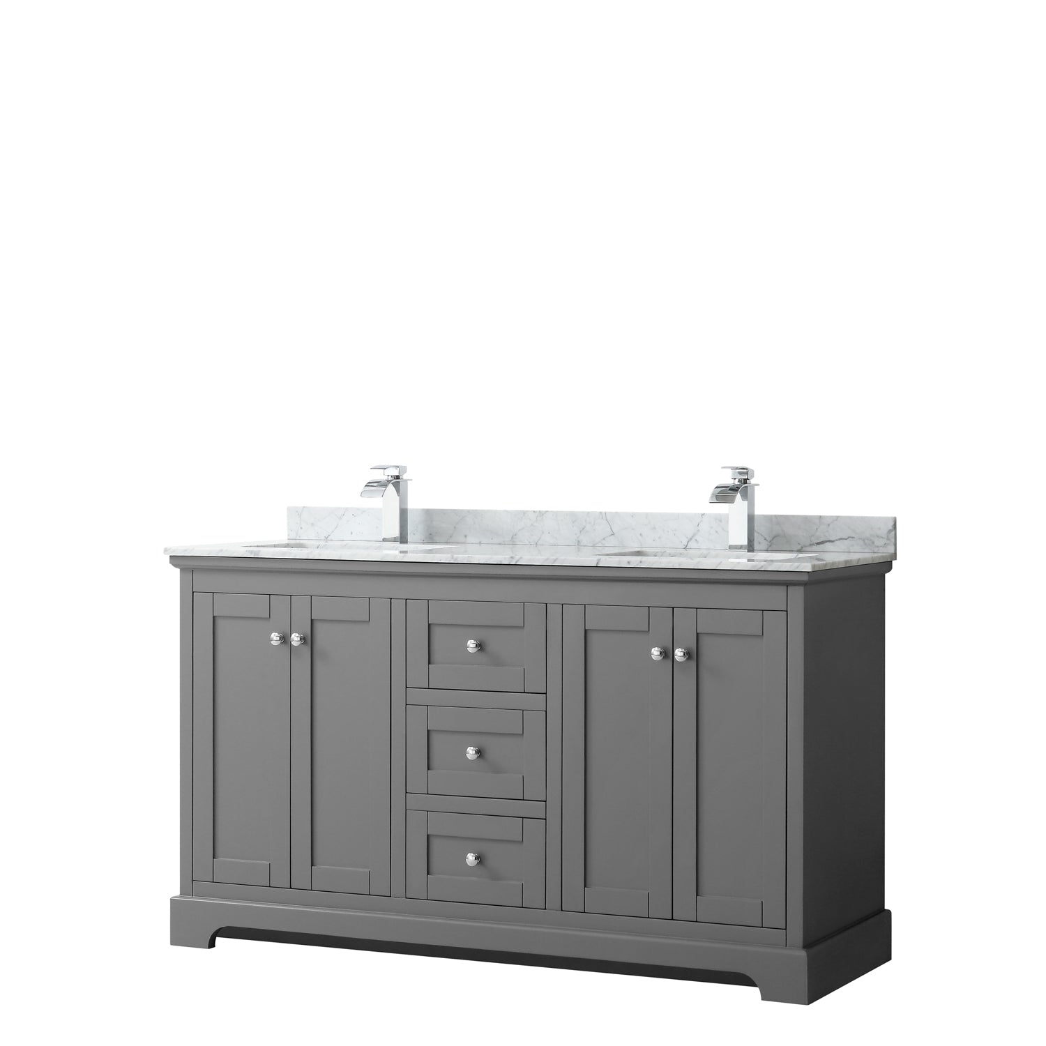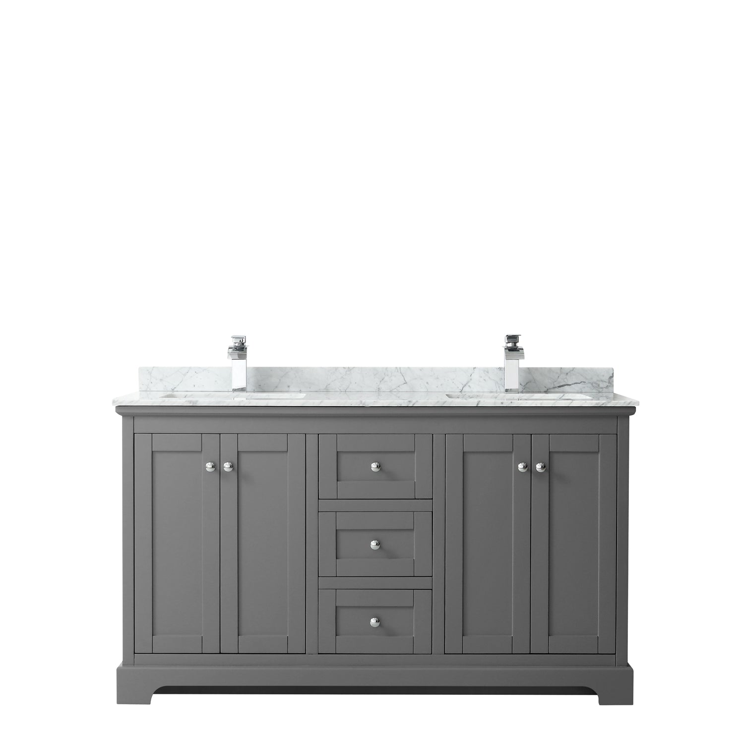 Avery 60 Inch Double Bathroom Vanity in Dark Gray, White Carrara Marble Countertop, Undermount Square Sinks, and No Mirror