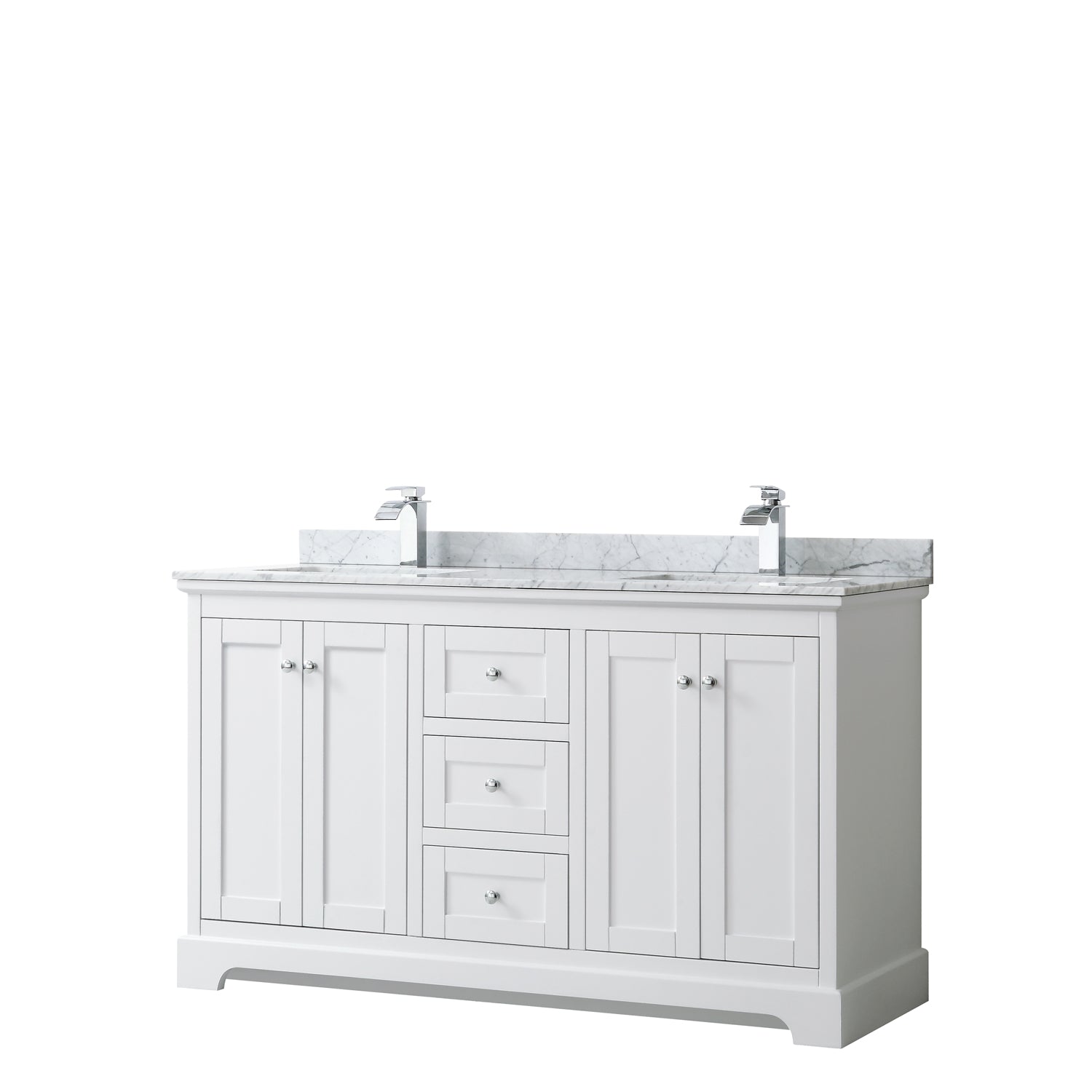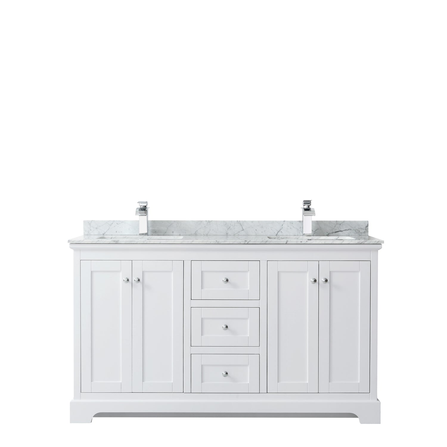 Avery 60 Inch Double Bathroom Vanity in White, White Carrara Marble Countertop, Undermount Square Sinks, and No Mirror