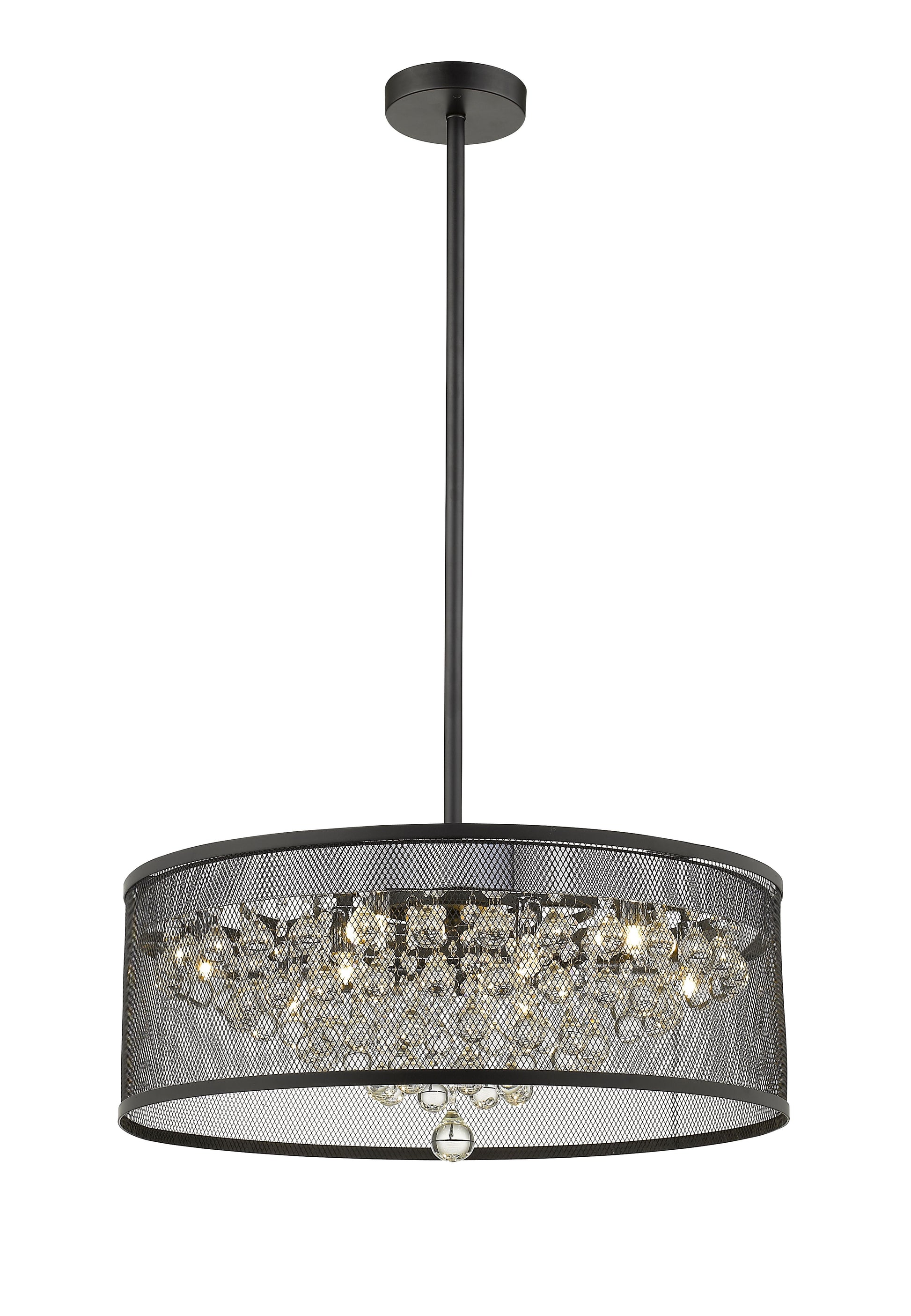 This single pendant light is in a black finish. The frame of this fixture is made out of metal. It comes with a metal mesh in black and chrome hardware. It also has crystal hanging balls in clear color. This modern fixture can be used in any room.
