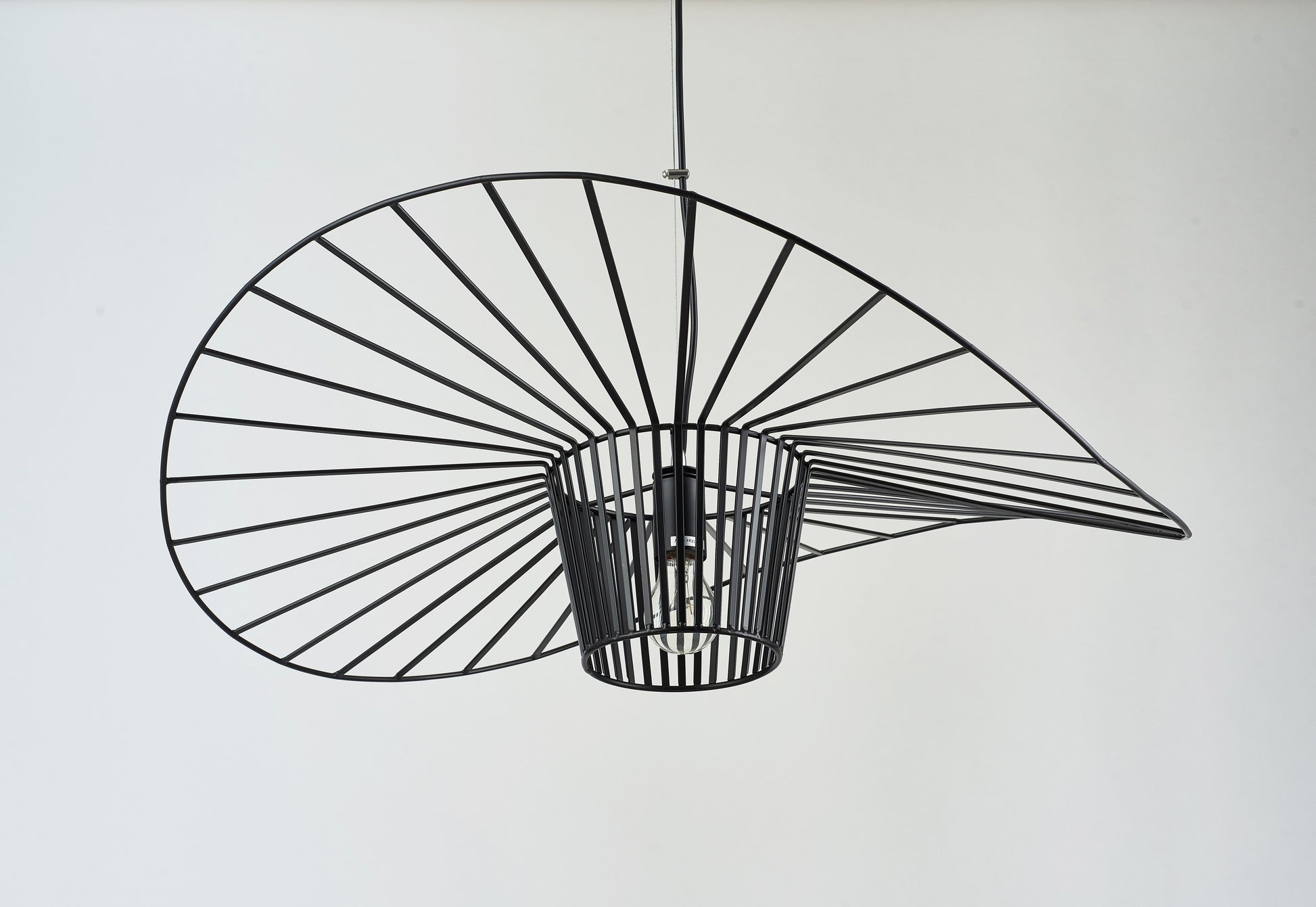 This unique fixture is in a black color. The shape of this fixture looks like a hat, and the frame is made out of iron. It can be used in any room.