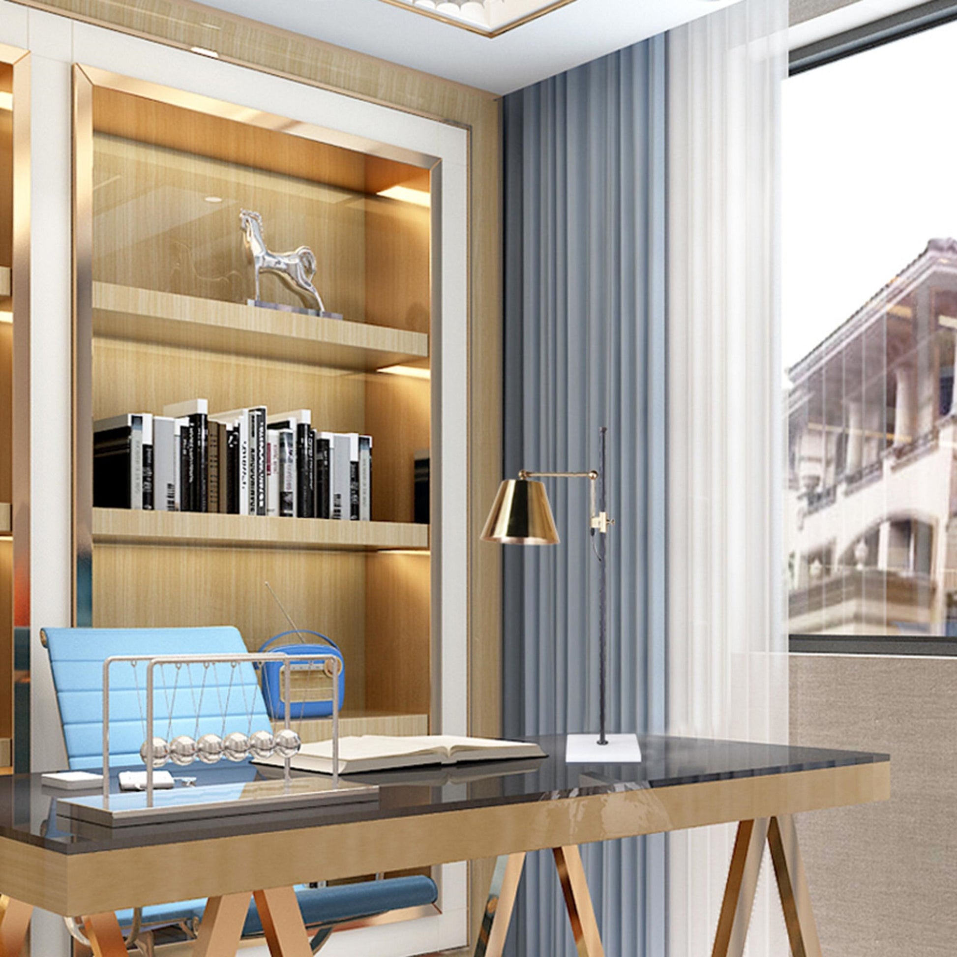 This table lamp contains a white marble base, black metal rod as a frame, and a brass metal shade. It is great for chair side reading or general room illumination.