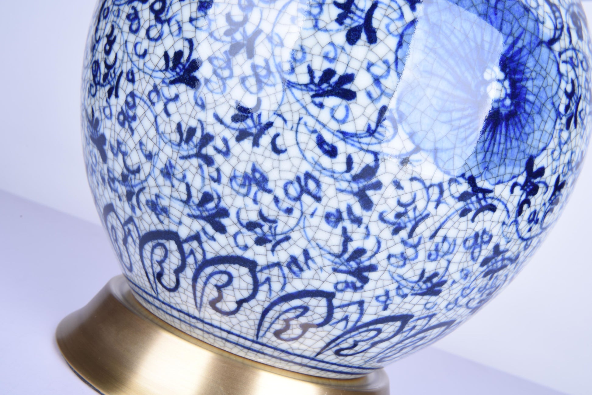 This exquisite table lamp is in blue and white finish. The body of this table lamp is made out of porcelain with had painting in blue and white color, and a metal base is on the bottom of the body in gold color. This modern table lamp is great for chair side reading or general room illumination.