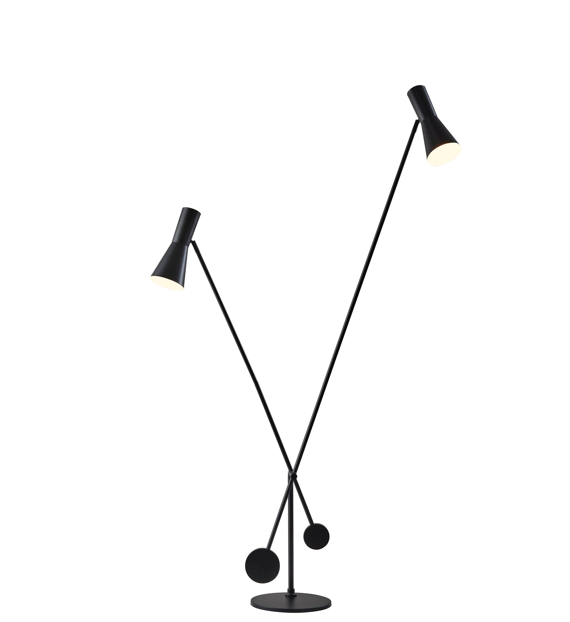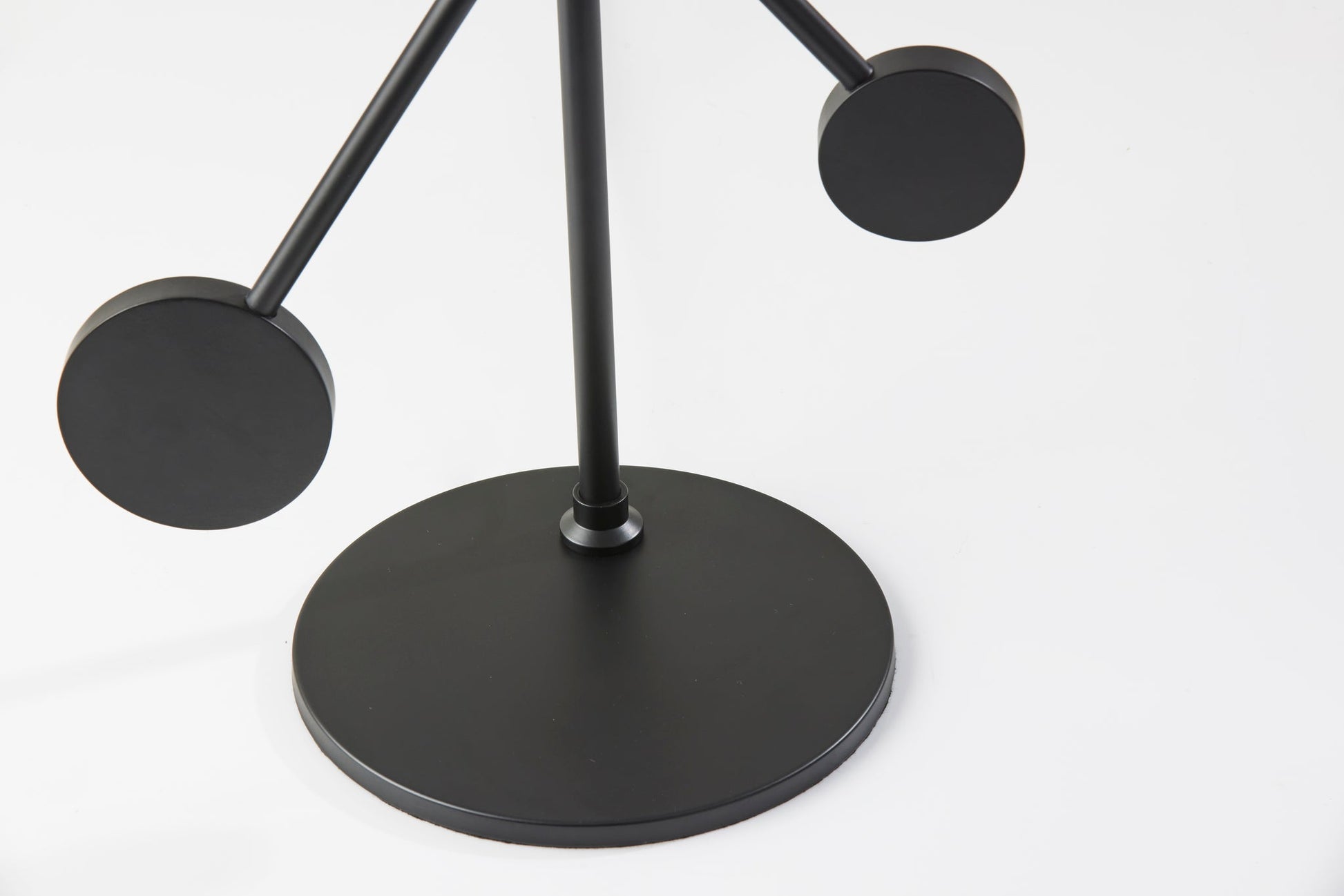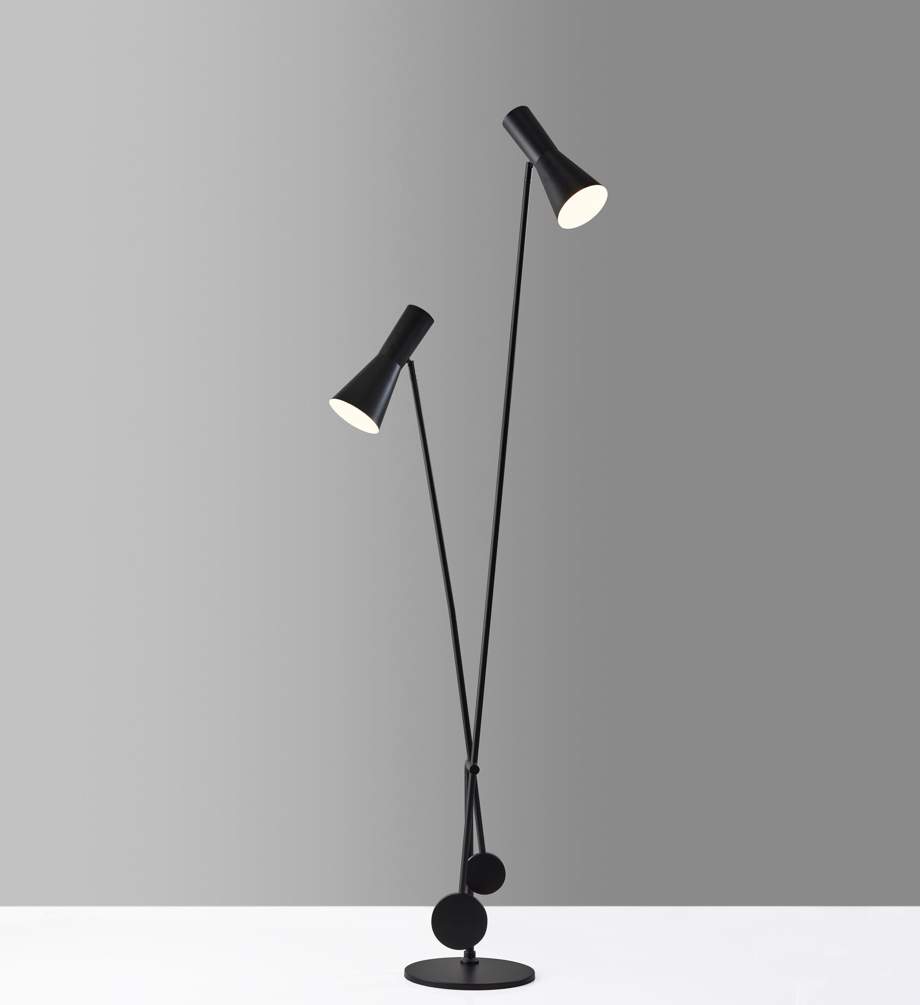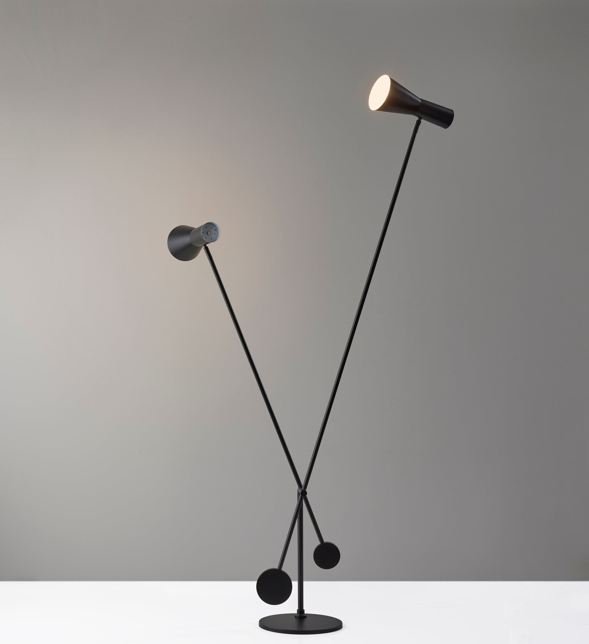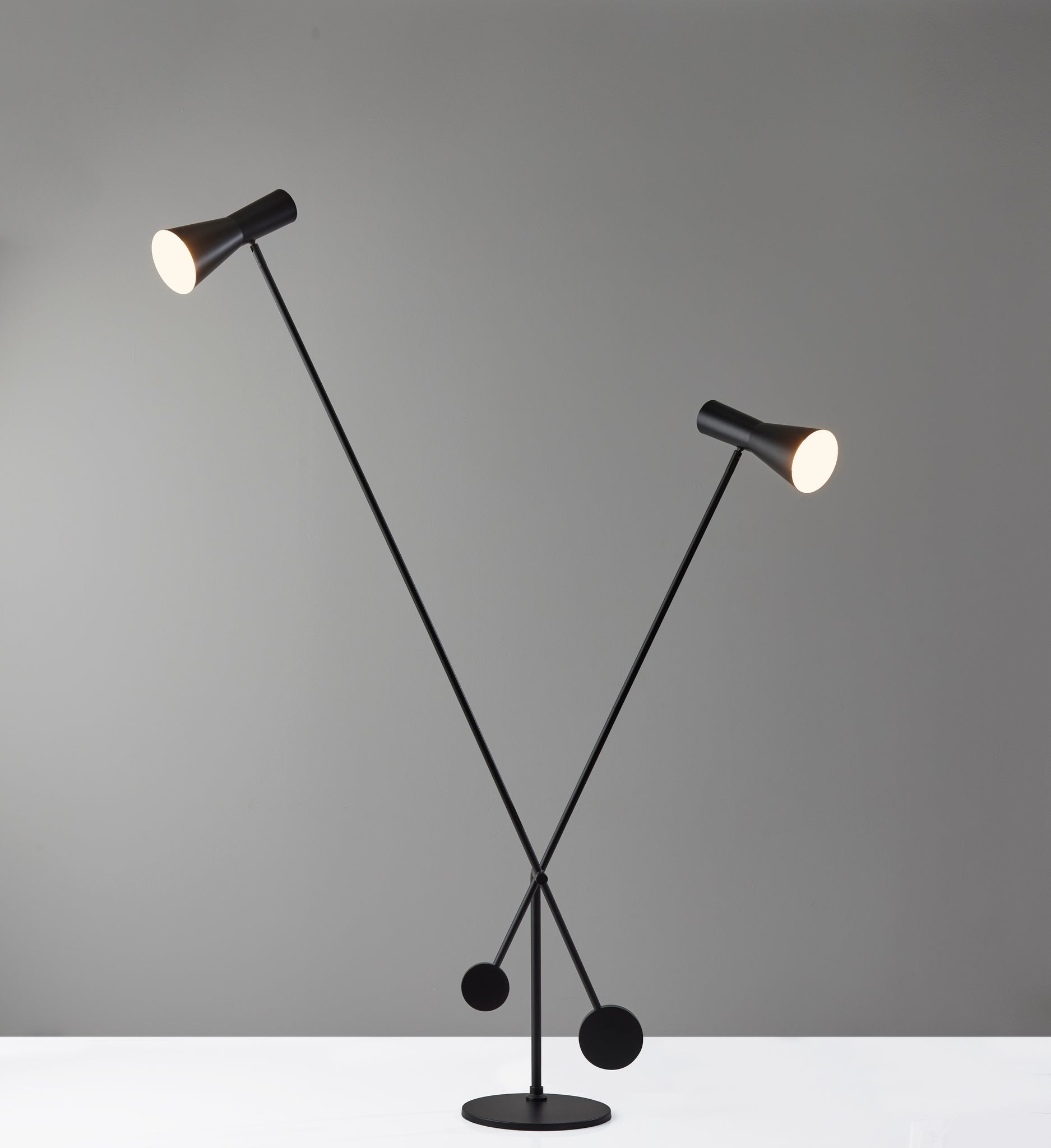 The Bond floor lamp by ADS360 is an artistic and functional statement piece to complete your modern industrial décor. Featuring two black cone metal shades affixed to two stems with round decorative ends, the lamp has a matching black metal stem and base. For maximum lighting and aesthetic versatility, both the direction of the shades and the angle of the stems can be adjusted to suit the spacing and lighting needs of any space. Based on the selected positioning, the floor lamp has a maximum height of 72.5 and a maximum width of 55 inches. Operated by touch switches located on the shades, the Bond floor lamp powers two 40W Type A bulbs (not included) and features a 5' black fabric-covered cord. Complete your interior design with the matching Bond desk lamp.