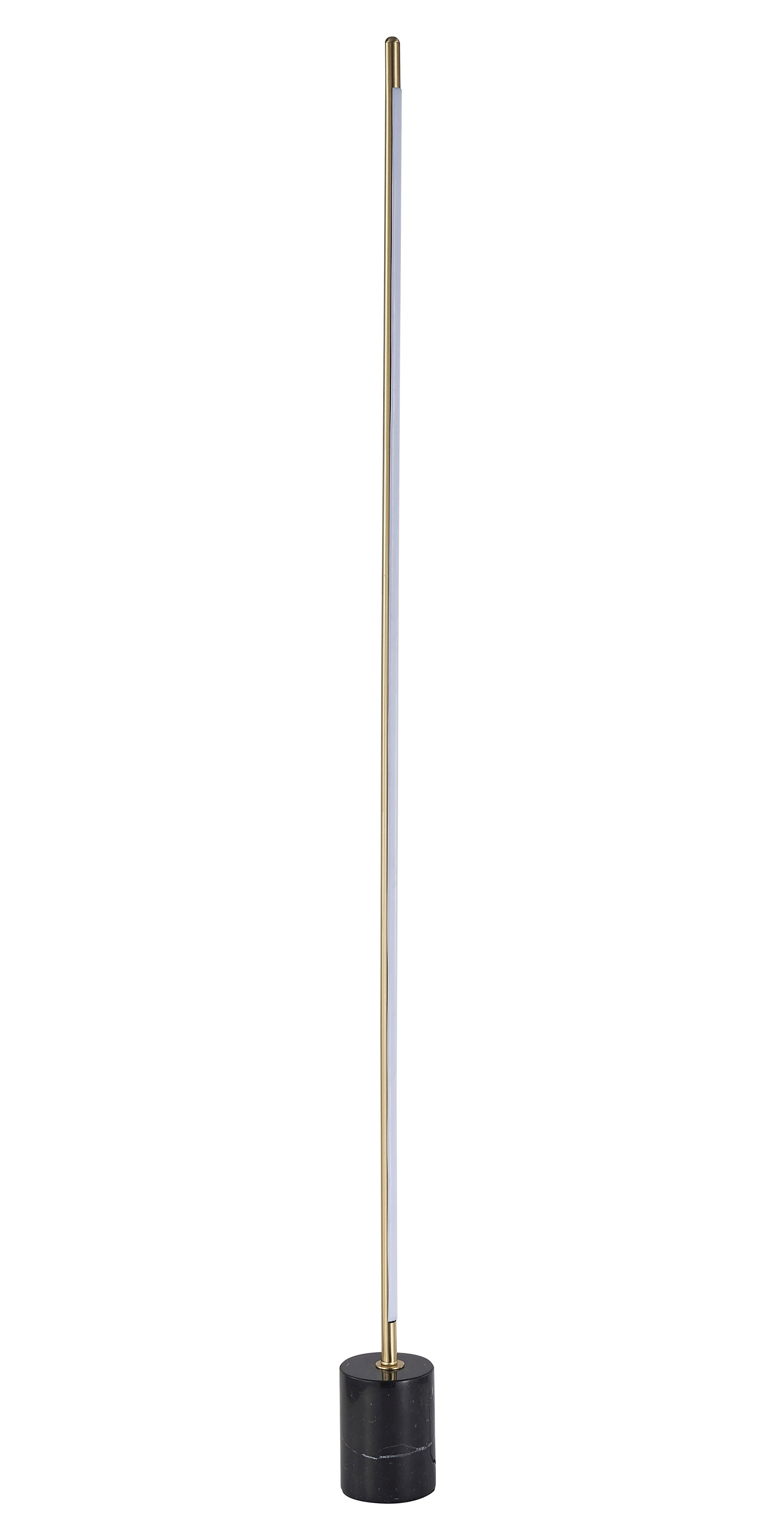 This LED floor lamp is in a brass and black finish. The frame is made out of stainless steel, and the LED bulb is integrated into the frame. It also comes with a black marble base and silicone diffuser. It is great for chair side reading or general illumination in any rooms.
