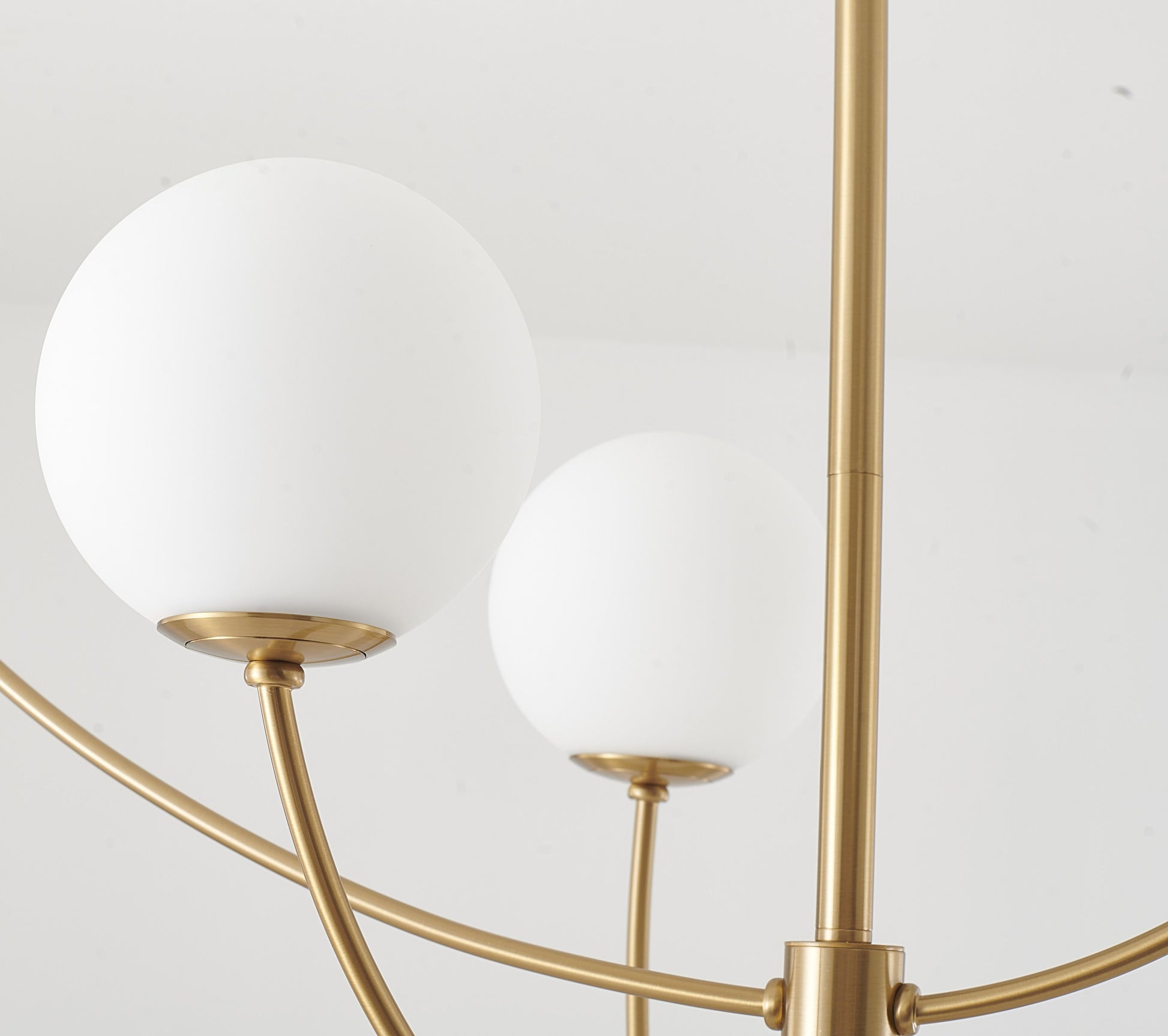 This exquisite chandelier is in a brass finish. The frame is made out of steel, and it comes with white glass shades. The adjustable rod link makes this fixture suitable for most ceiling heights.
