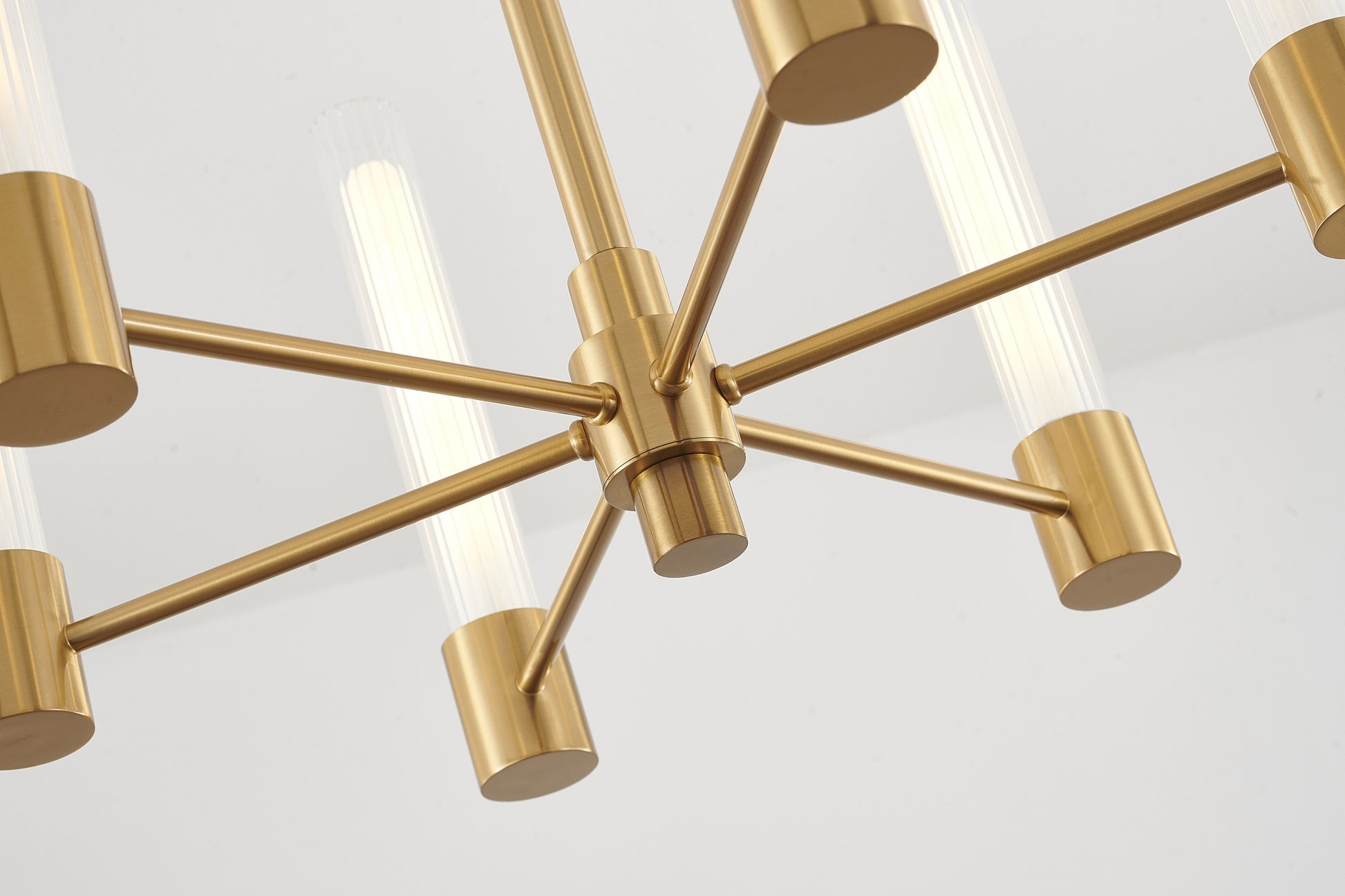 This exquisite chandelier is in a brass finish. The frame is made out of steel, and it comes with clear glass shades. The adjustable rod link makes this fixture suitable for most ceiling heights.