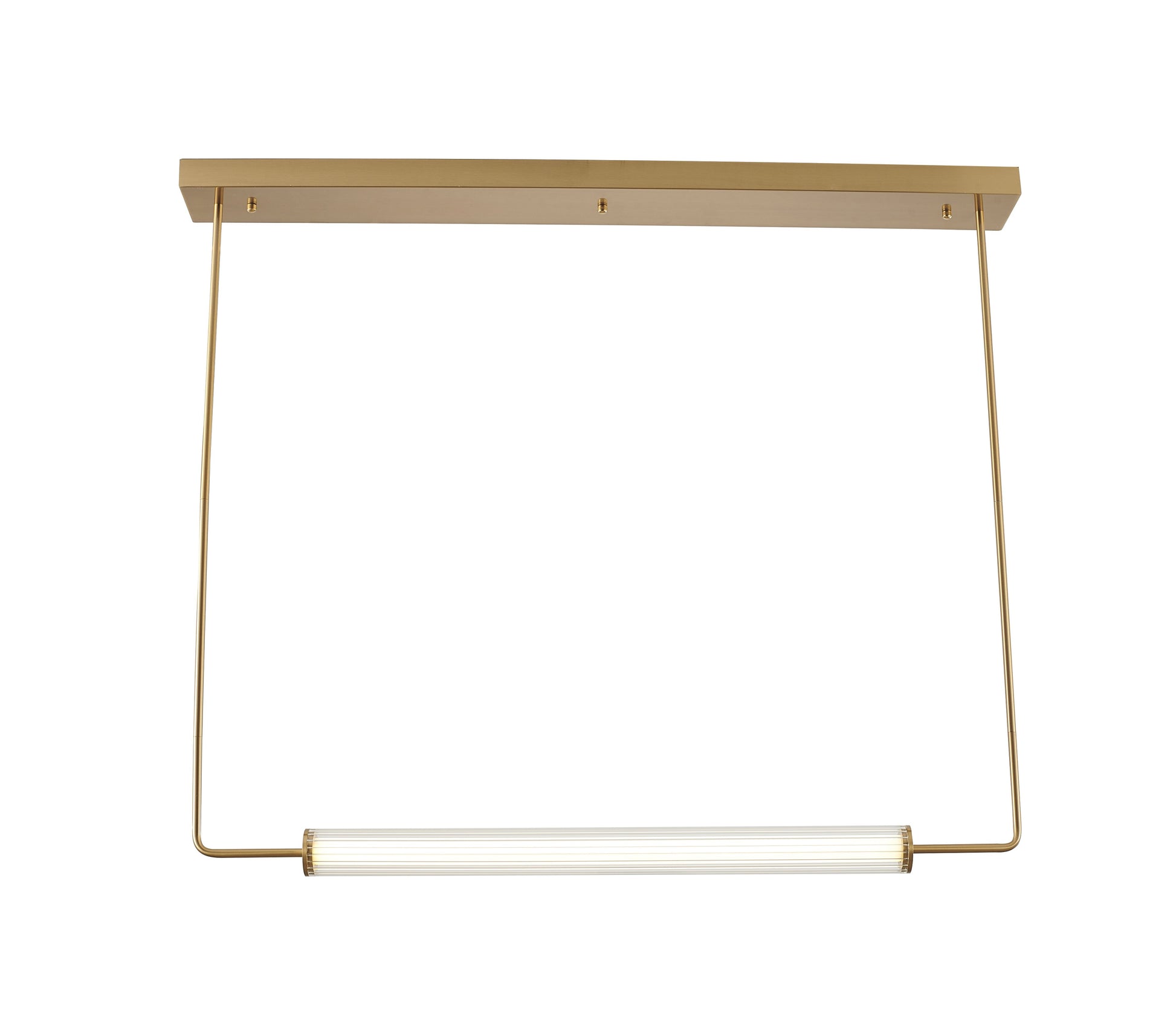 This exquisite LED chandelier is in a brass finish. The frame is made out of stainless steel, and it comes with a clear and white glass shade. The adjustable rod links make this fixture suitable for most ceiling heights.