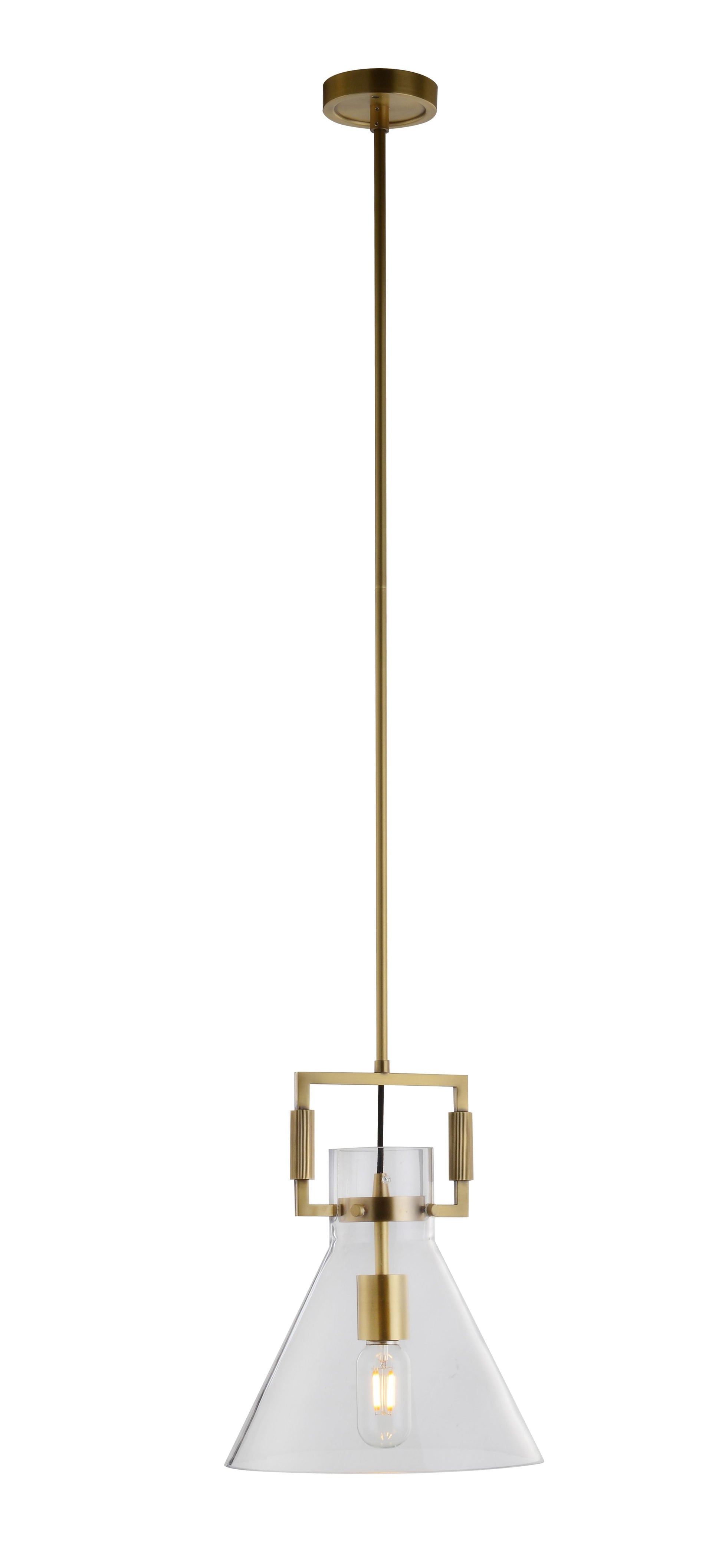 This exquisite single pendant lighting is in a brass finish. The frame is made out of metal, and it comes with a corn glass shade in clear color. The adjustable rod link makes this fixture suitable for most ceiling heights.