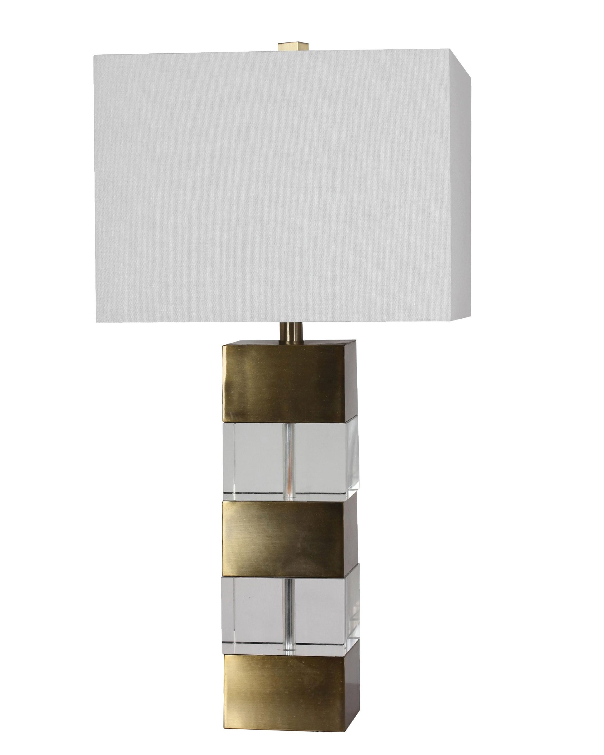 This modern table lamp has an antique brass metal frame. The base is made out of crystal in clear color and antique brass metal. It comes with a linen shade in an off-white color
