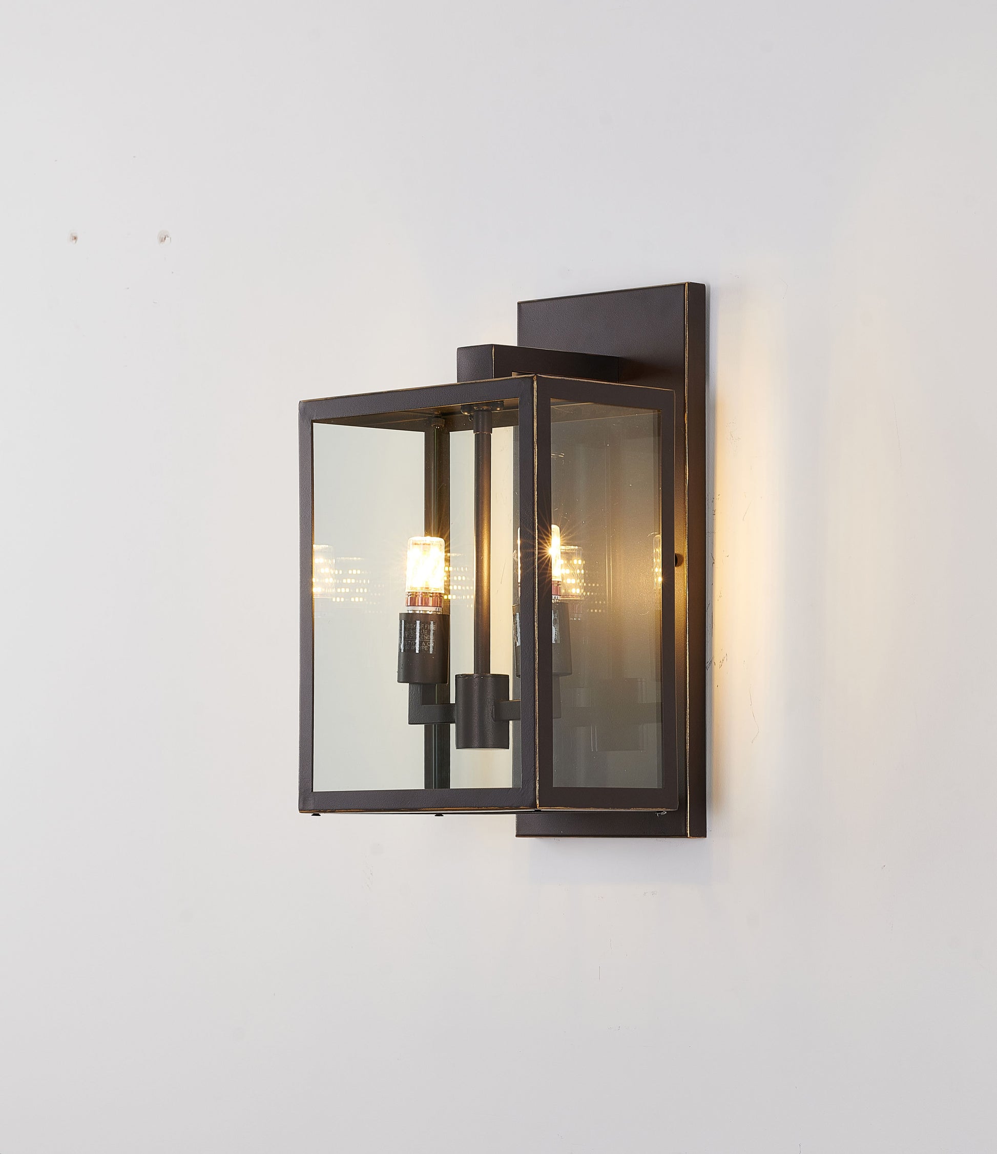 This outdoor wall sconce is in a bronzed black finish. The frame is made out of stainless steel, and it comes with a clear glass cover. The 2 E12 bulbs (sold separately) can provide enough illumination.