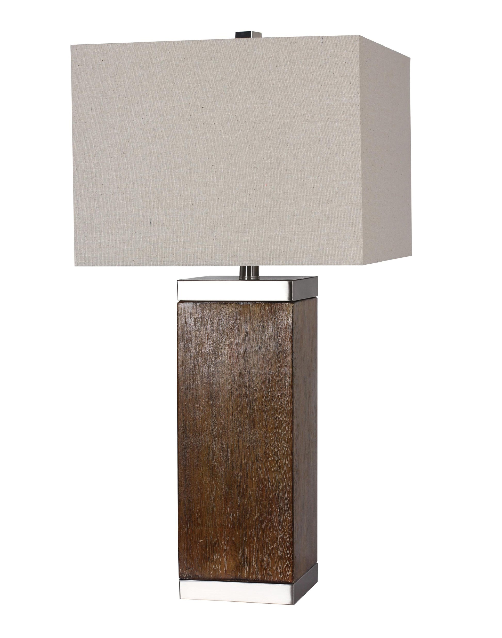 This modern table lamp has a chrome Polynesian frame. It has a walnut body and comes with a linen shade in oatmeal color.