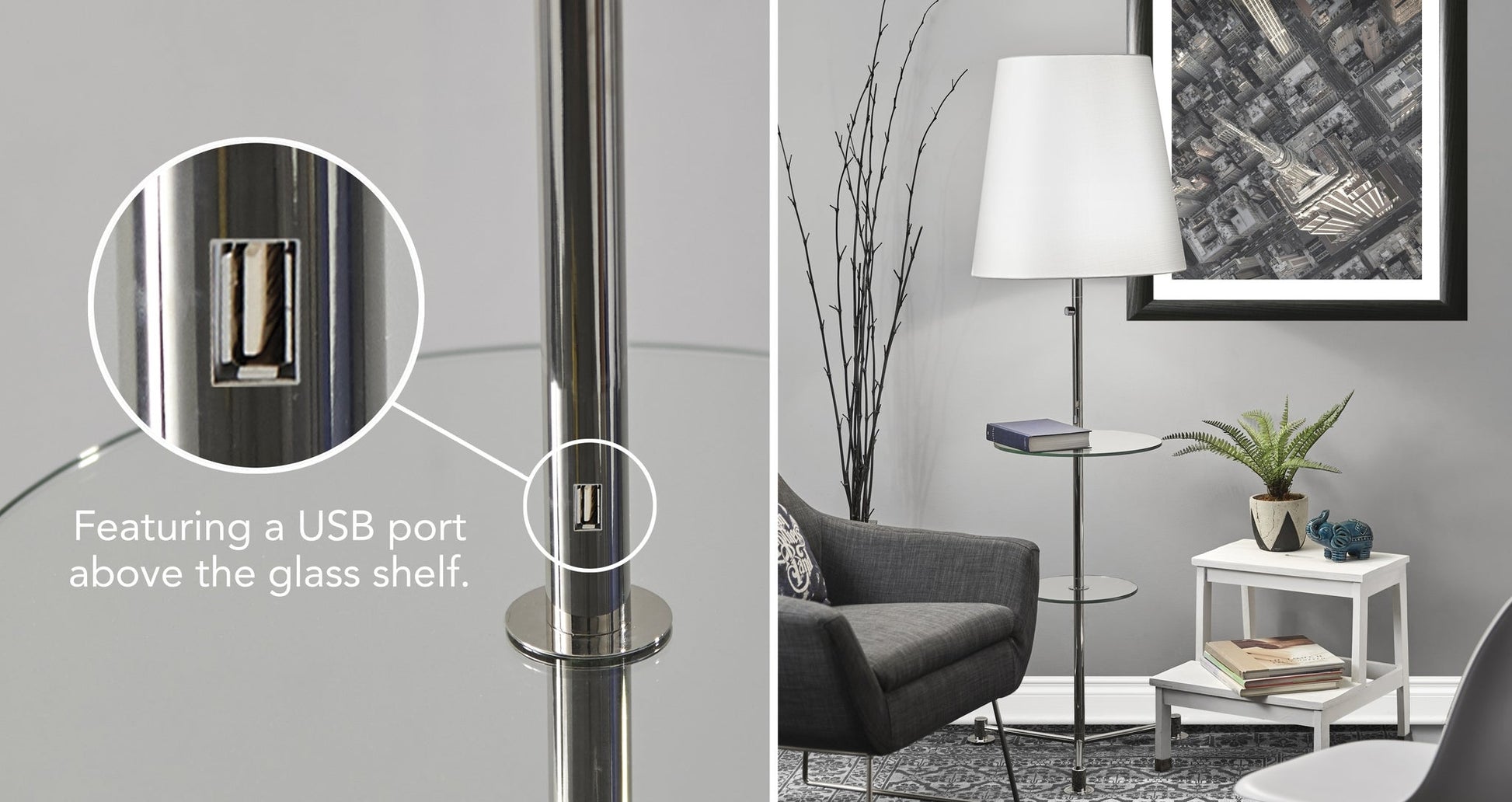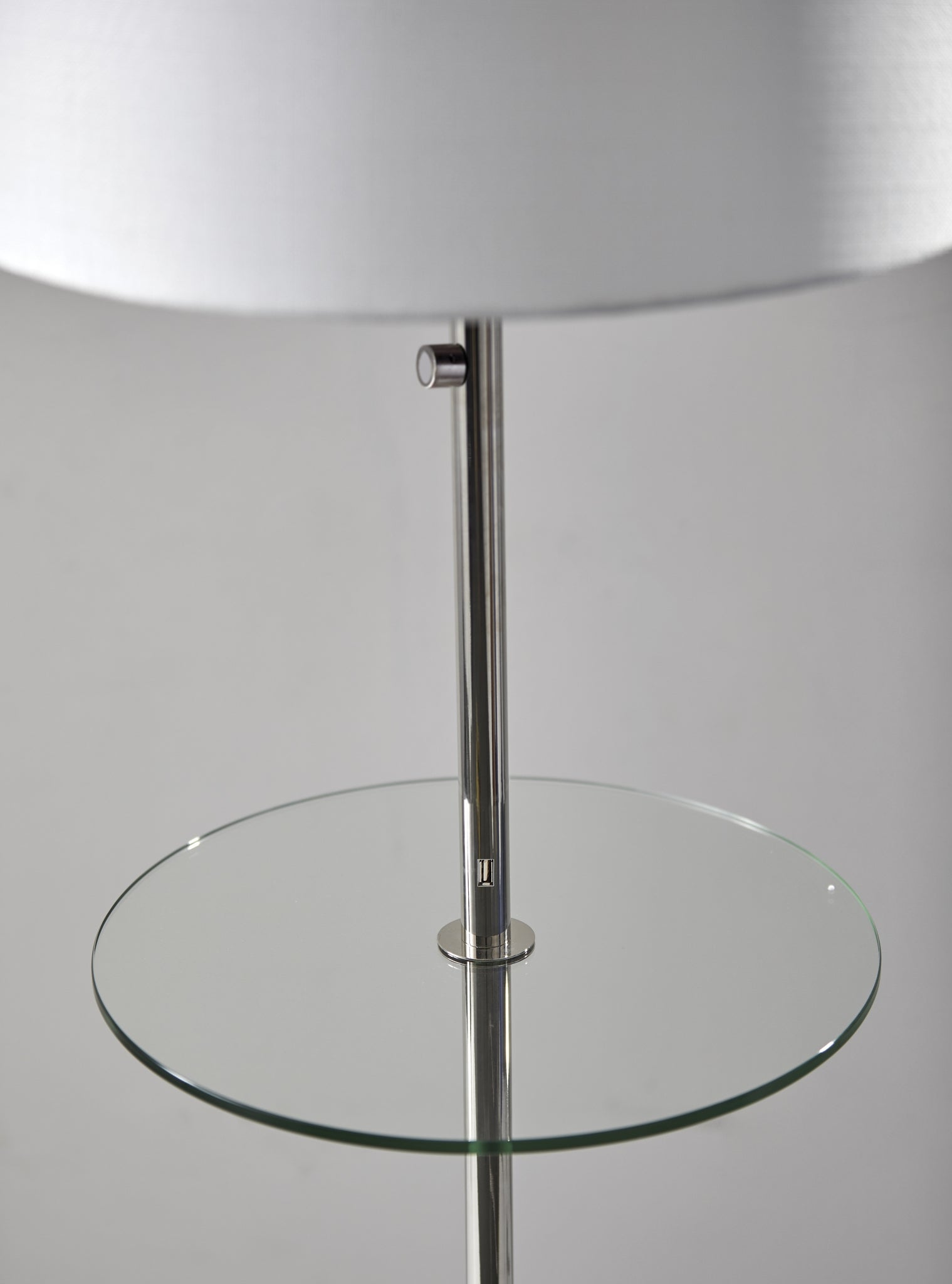 A stately and elegant style, the Channing Shelf Floor Lamp is not only a functional floor lamp but also a beautiful piece of furniture. A large, textured white fabric shade sits atop a thick polished nickel pole with two round tempered glass shelves. Set this piece next to the bedside or couch for an ideal solution for lighting and storage. A double socket allows for two 60 Watt bulbs, facilitating bright, warm room lighting. A USB port is located on the pole for convenient charging of smart devices. A simple rotary switch on the pole turns the lamp on and off.