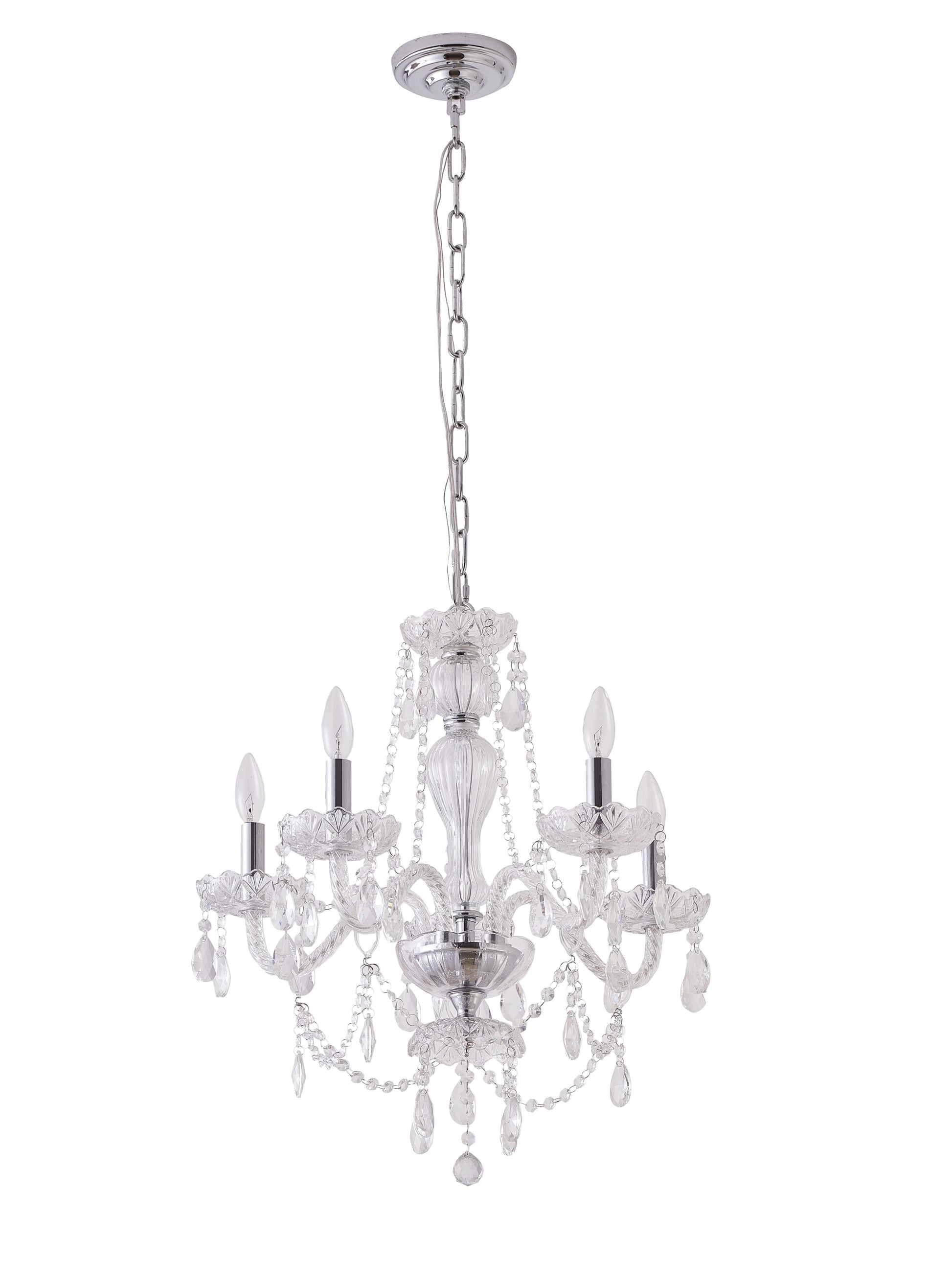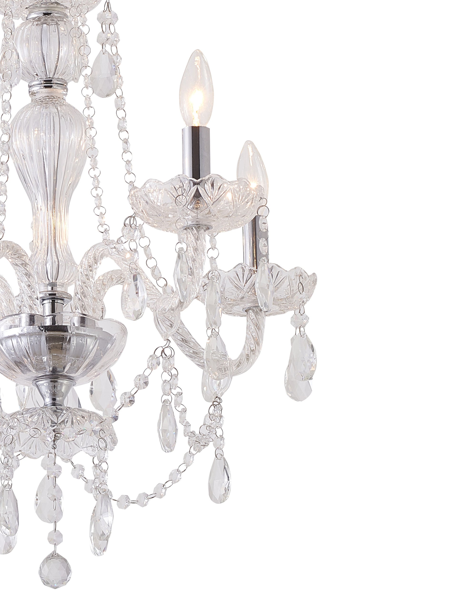 This exquisite chandelier is in a chrome finish. The frame is made out of metal with clear glass arms, and it also comes with clear crystal accents. The adjustable chain link makes this fixture suitable for most ceiling heights.