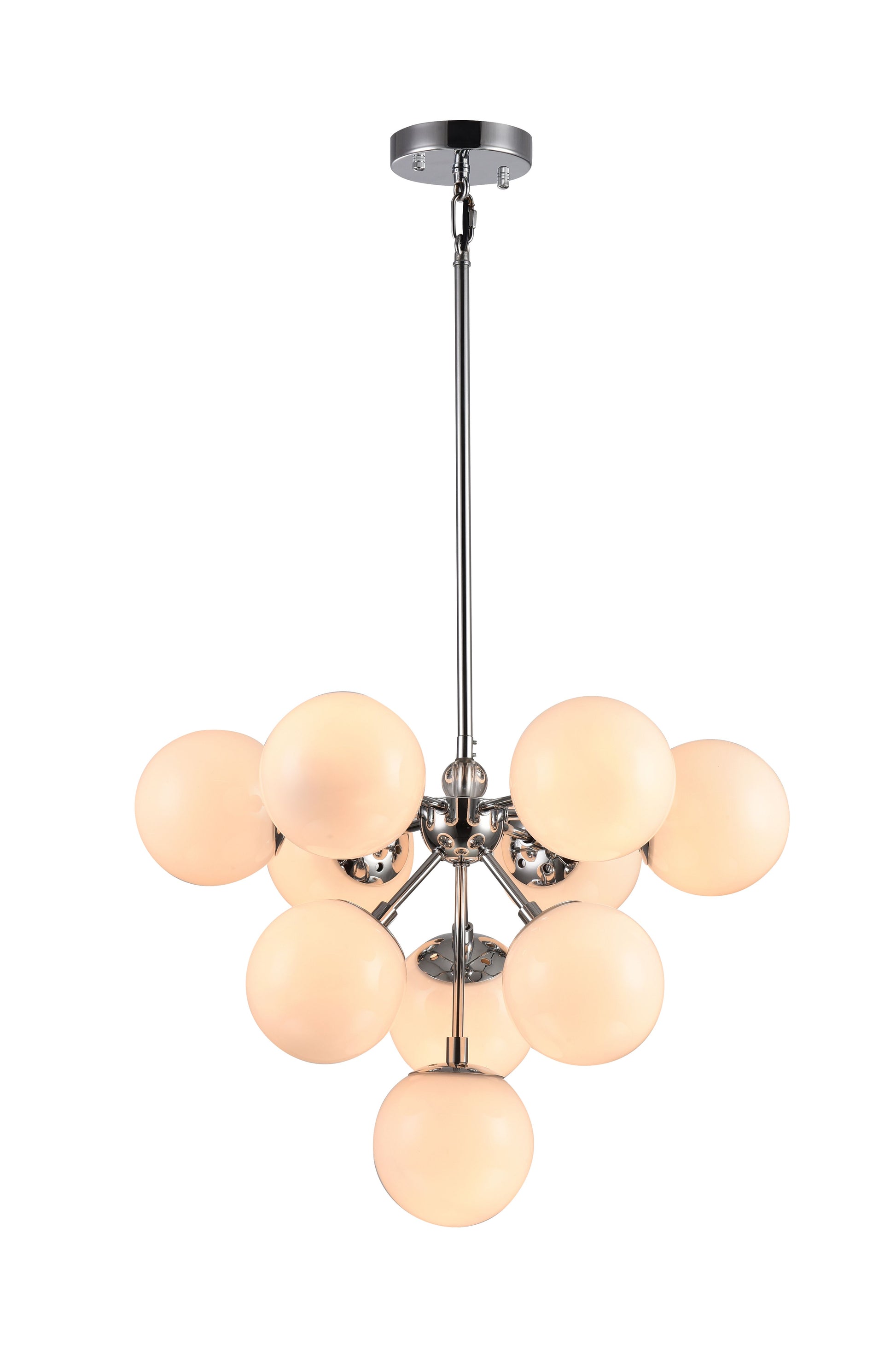 This exquisite ceiling fixture has a chrome metal frame. It comes with glass white shades in an ORB shape. The adjustable rod link makes this fixture suitable for most ceiling heights.