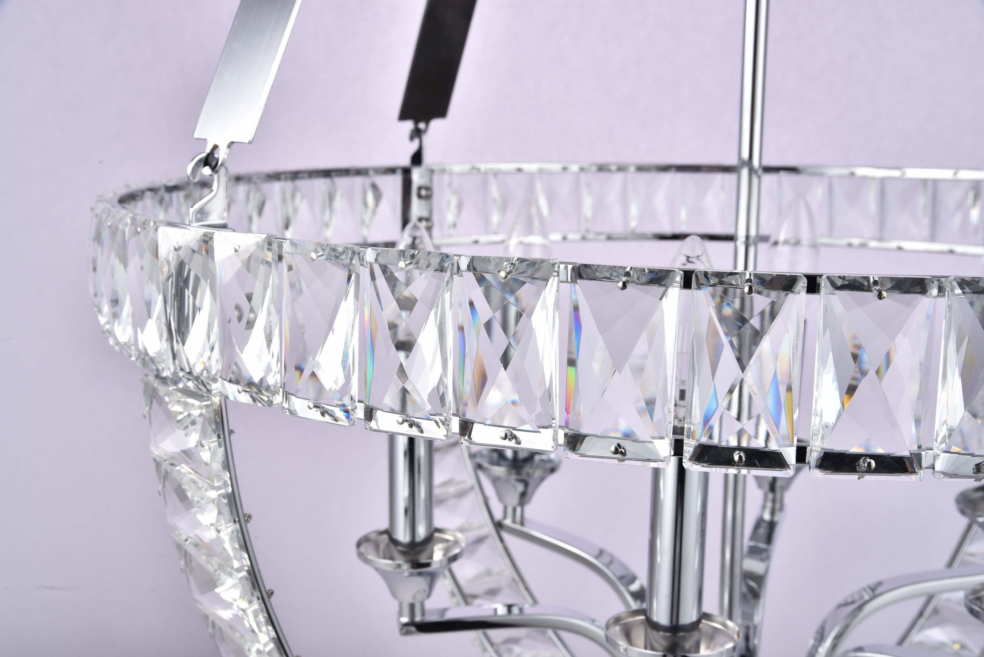 This modern chandelier is in a chrome finish. The shape of this fixture looks like a basket, and clear crystal accents are on the frame.