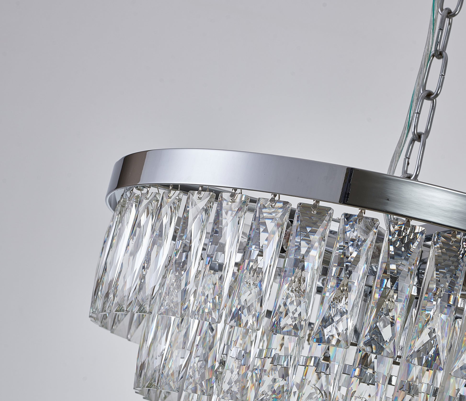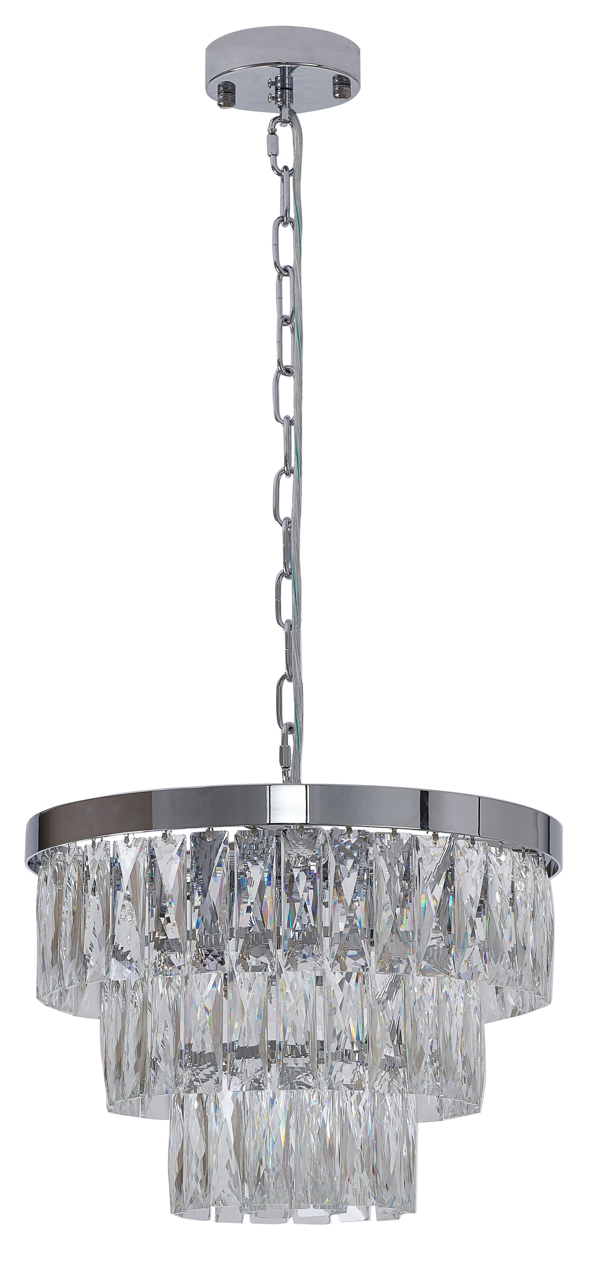 This chandelier has three tiers in a round shape, the frame is made out of metal in a chrome finish. It comes with clear hanging crystal accents. The adjustable chain link makes this chandelier suitable for most ceiling heights, and it also can be hung as a semi flush mount.