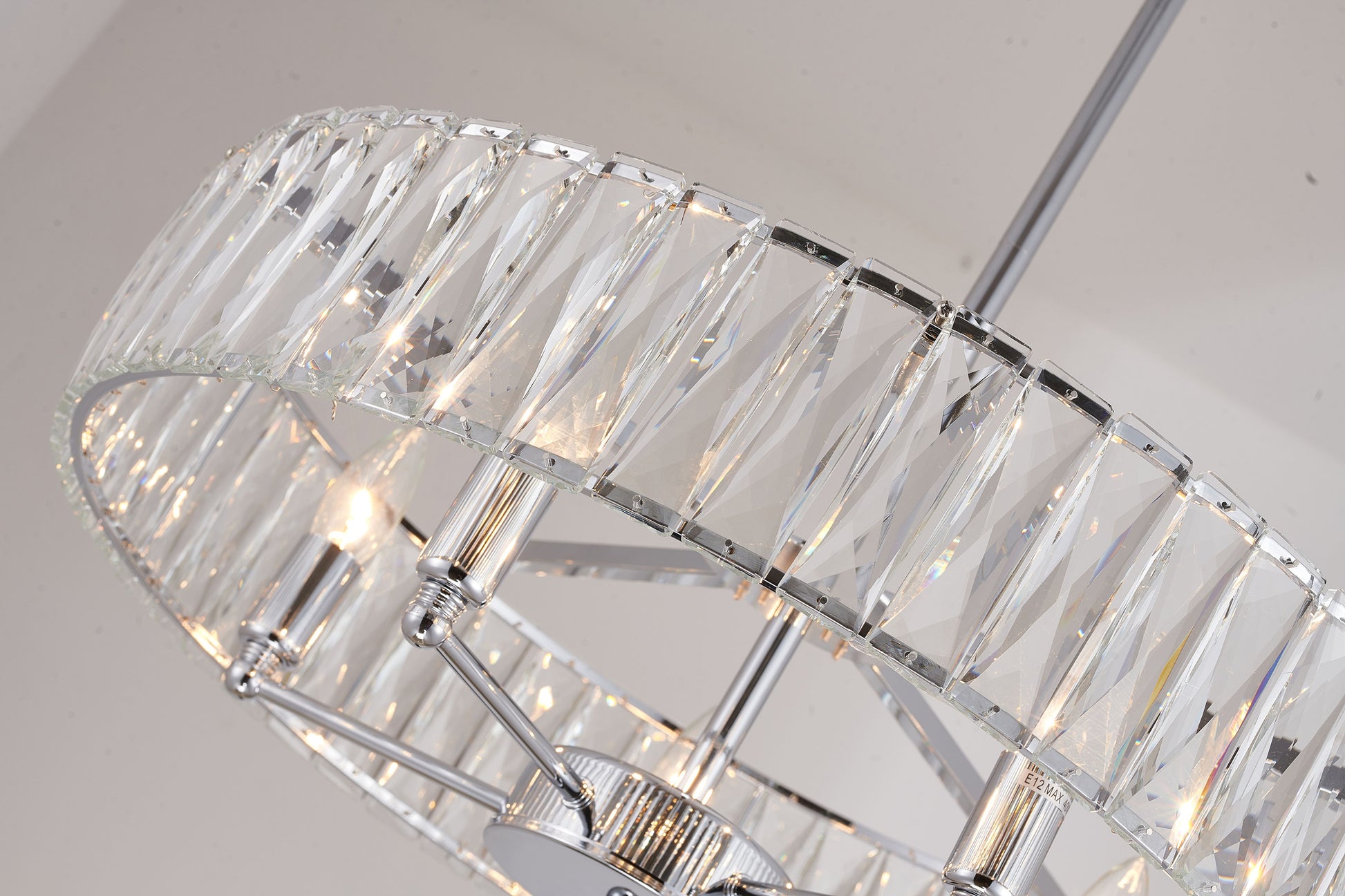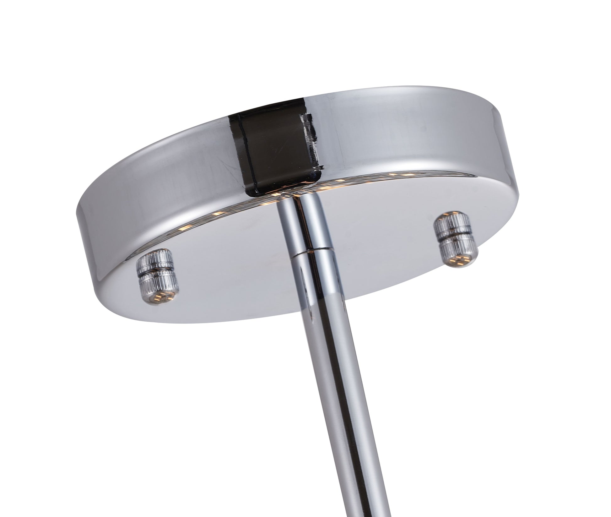 This exquisite chandelier is in a chrome finish. The frame is made out of metal, and it comes with clear crystal accents. The adjustable rod link makes this fixture suitable for most ceiling heights.