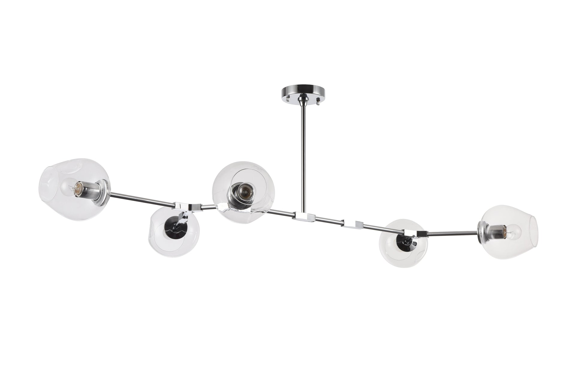 This ceiling fixture has a chrome metal frame. It comes with indented glass shades in clear color. The adjustable rod link makes this fixture suitable for most ceiling heights.