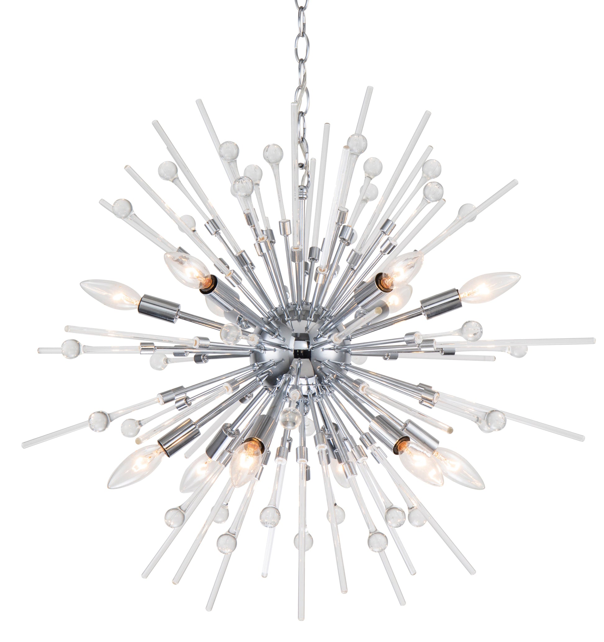 This exquisite chandelier is in a chrome finish. The frame is made out of metal, and it comes with glass sputnik. The adjustable chain link makes this fixture suitable for most ceiling heights.