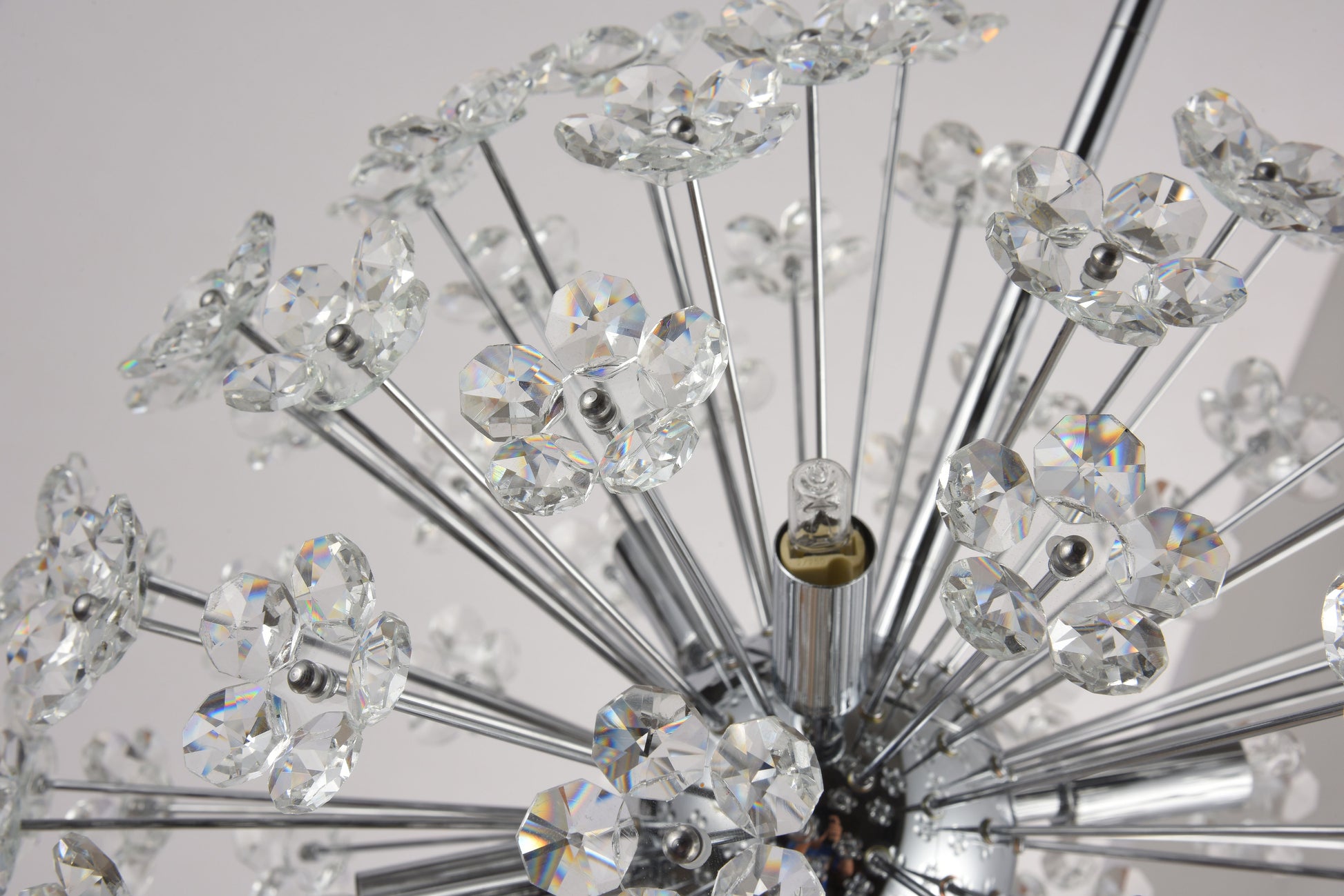 This exquisite chandelier is in a chrome finish. The frame is made out of metal, and it comes with clear crystal accents in sputnik flower shape. The adjustable rod link makes this fixture suitable for most ceiling heights.