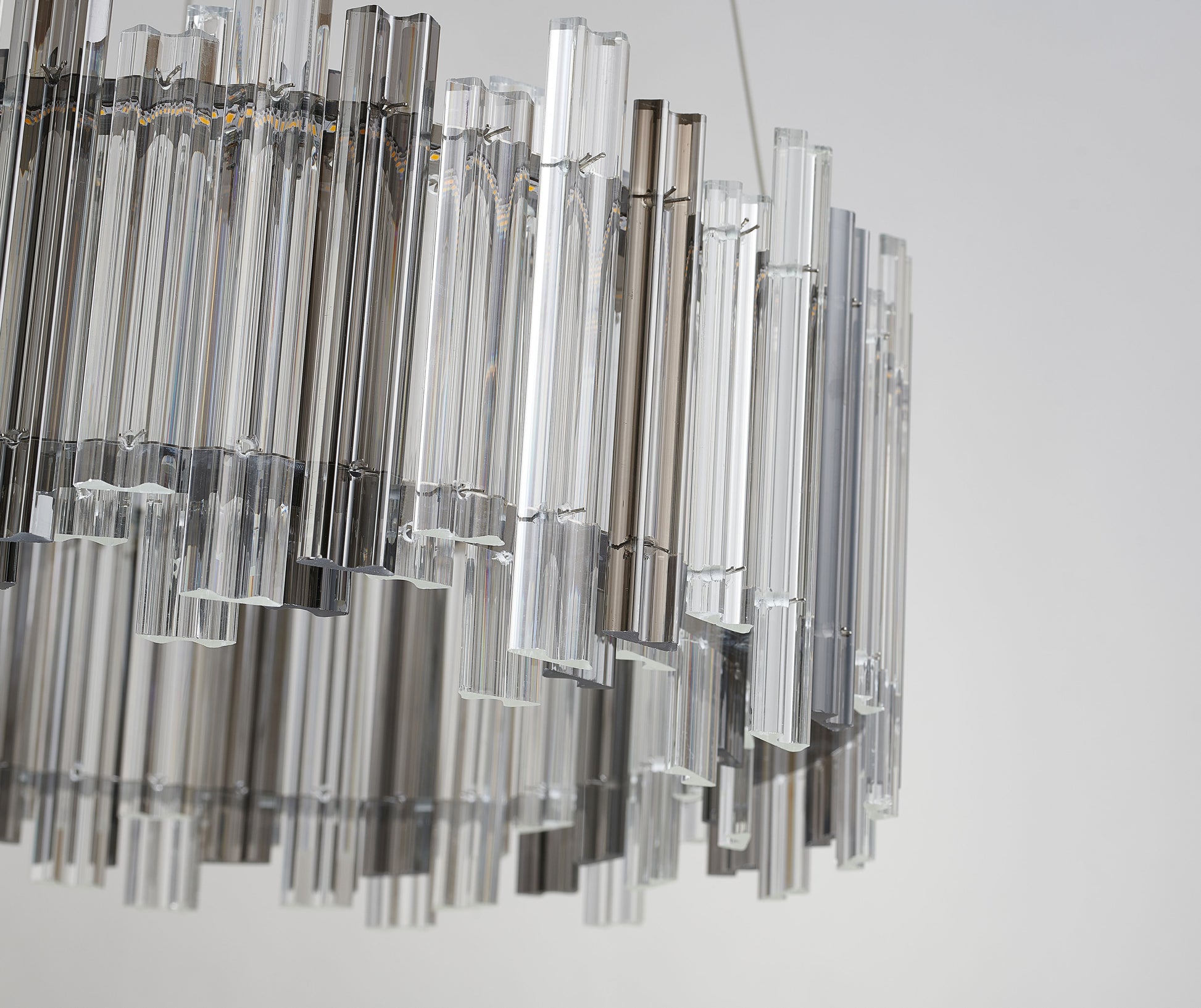 This exquisite LED lighting is in a chrome finish. The frame is made out of metal, and it comes with glass accents in clear and smoke accents. The adjustable cord links make this fixture suitable for most ceiling heights.