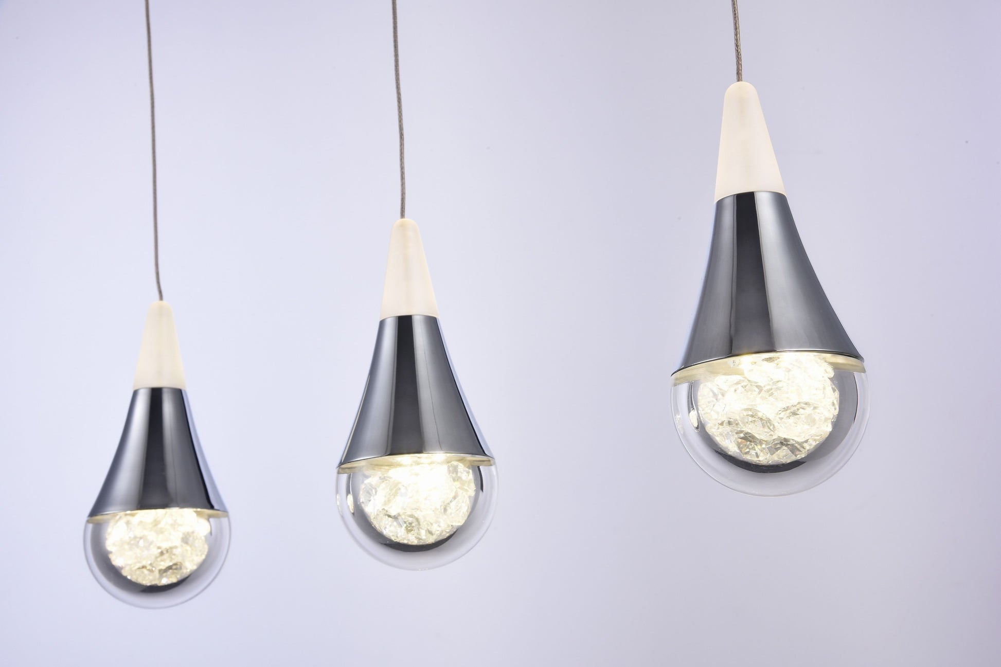 This exquisite LED lighting is in a chrome finish. The frame is made out of metal, and it comes with clear glass shades and clear crystal accents. The LED bulbs are integrated into the fixture. The cord links can be adjustable.