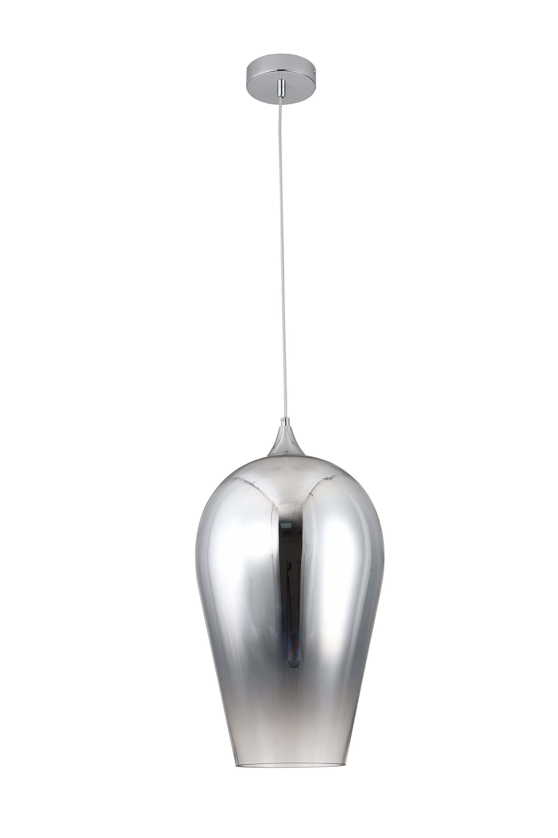 This exquisite single pendant light is in a chrome finish. The frame is made out of steel, and it comes with a reflective chrome faded glass shade. Install a pair of pendants in your entryway, or three over your kitchen island to create a cohesive look.