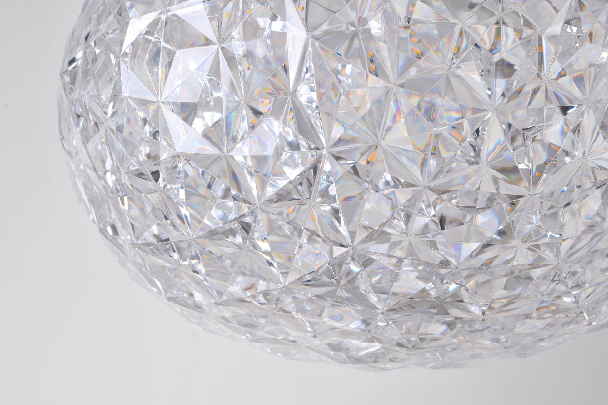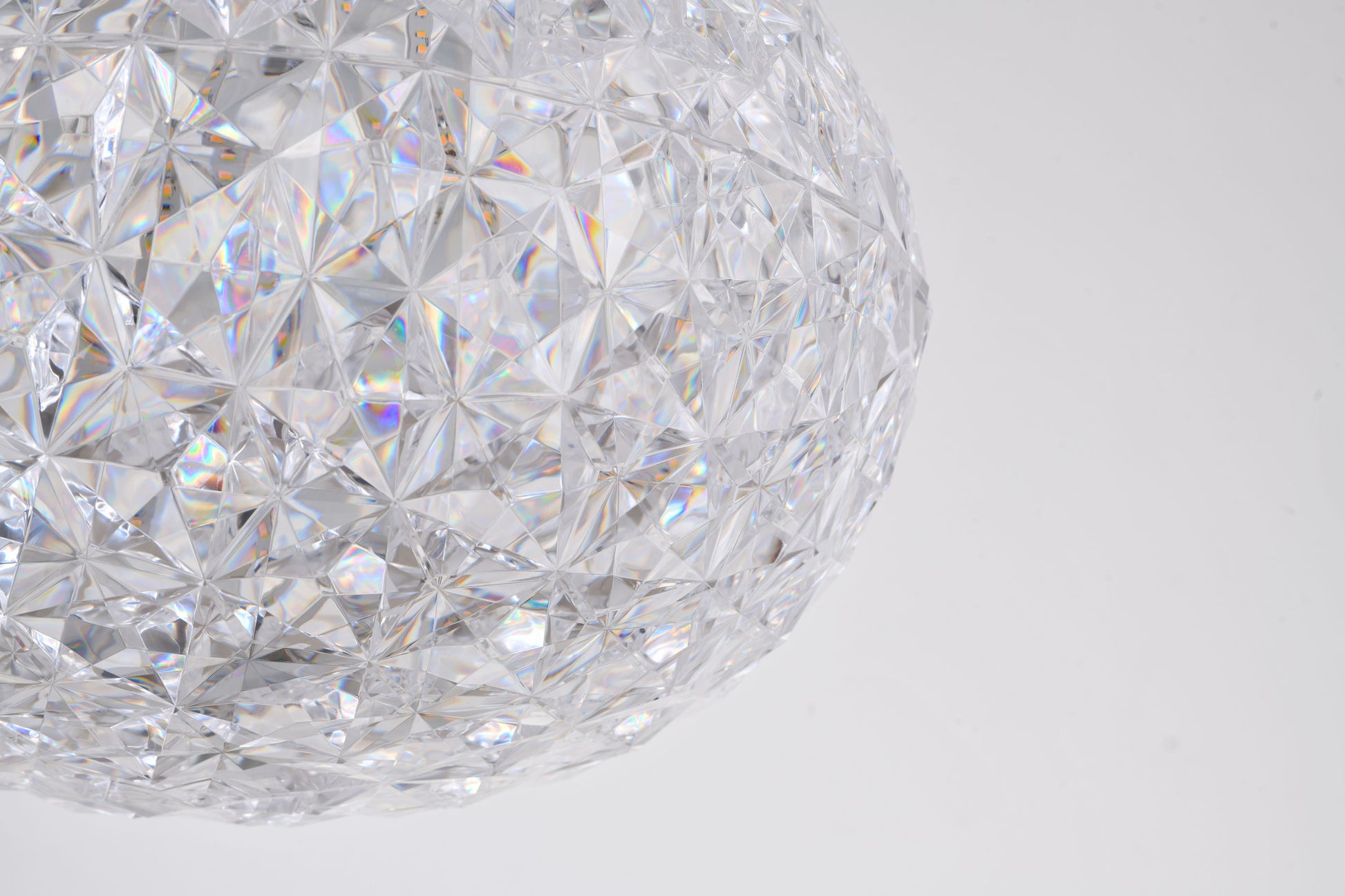This LED single pendant lighting is in a chrome color, the frame is made out of acrylic, and the LED bulb is integrated into the frame. It also comes with chrome metal hardware, and the adjustable cord link makes this fixture suitable for most ceiling heights.