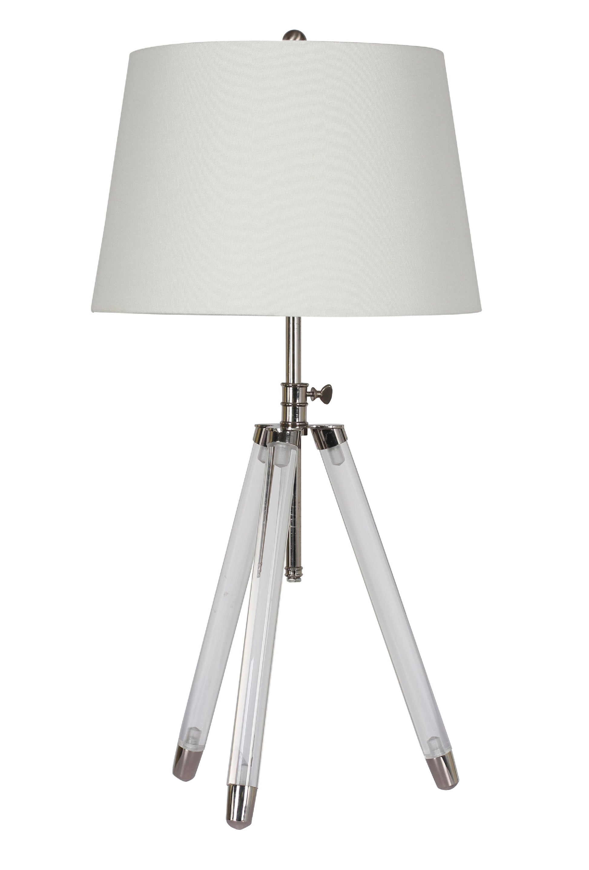 This modern tripod table lamp is in a chrome finish. The frame is made out of metal, and it has three acrylic legs in clear color. It also comes with drum linen shade in white color. It is great for chair side reading and general room illumination