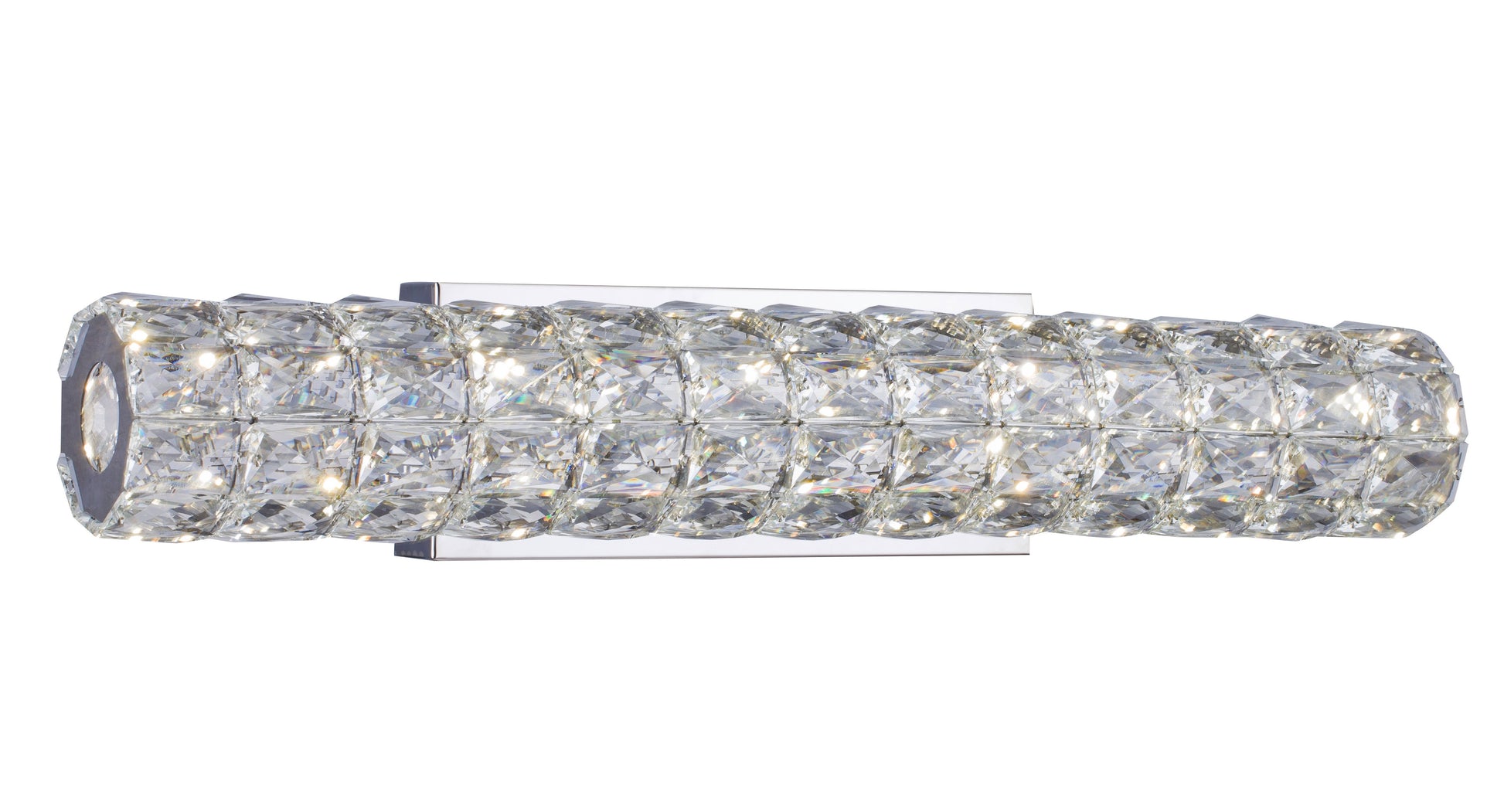 This exquisite LED wall sconce is in a chrome finish. The frame is made out of metal, and the LED bulbs are integrated into the frame. It comes with crystal accents in clear color.