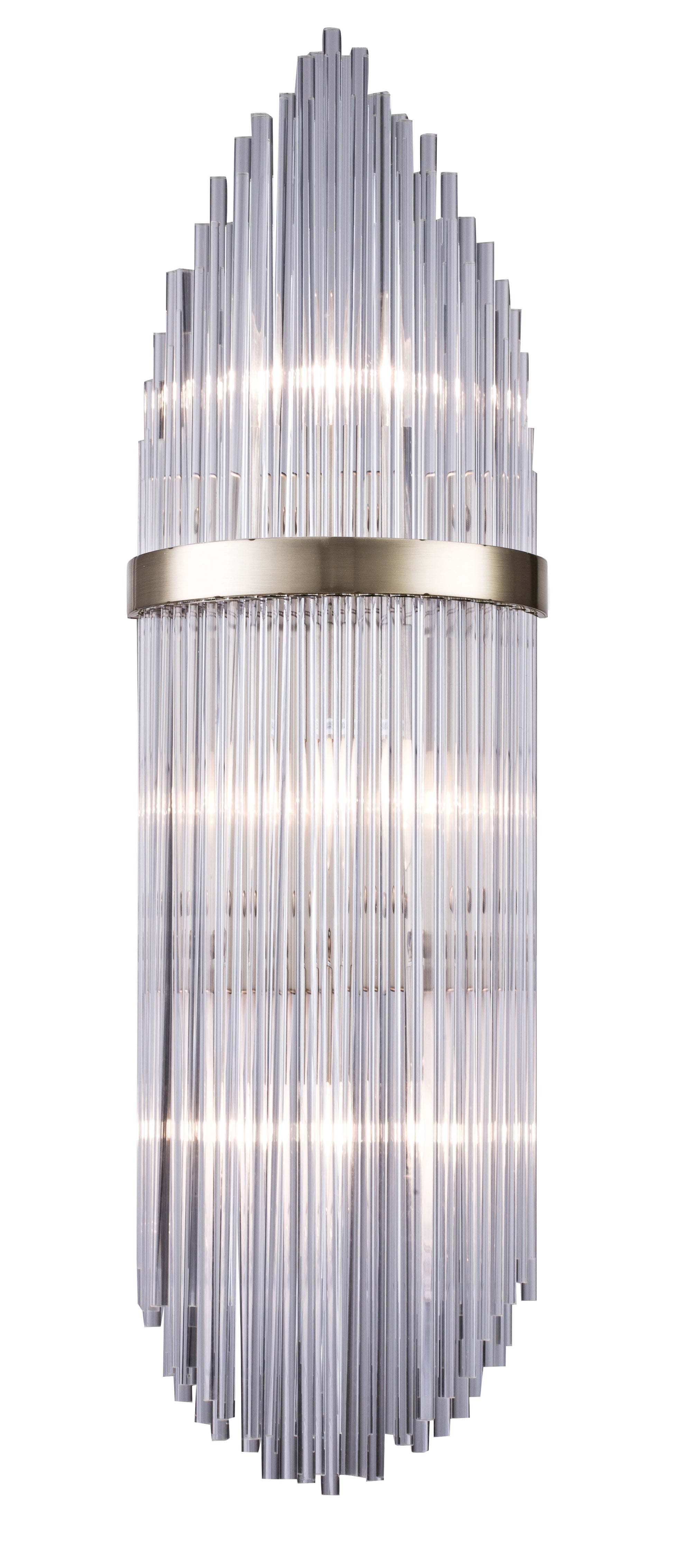 This modern wall sconce is in a chrome finish. The frame is made out of metal, and it comes with glass rods accents in clear color. This wall sconce can be used in modern vanities, hallways, and more., and can be mounted horizontally or vertically.